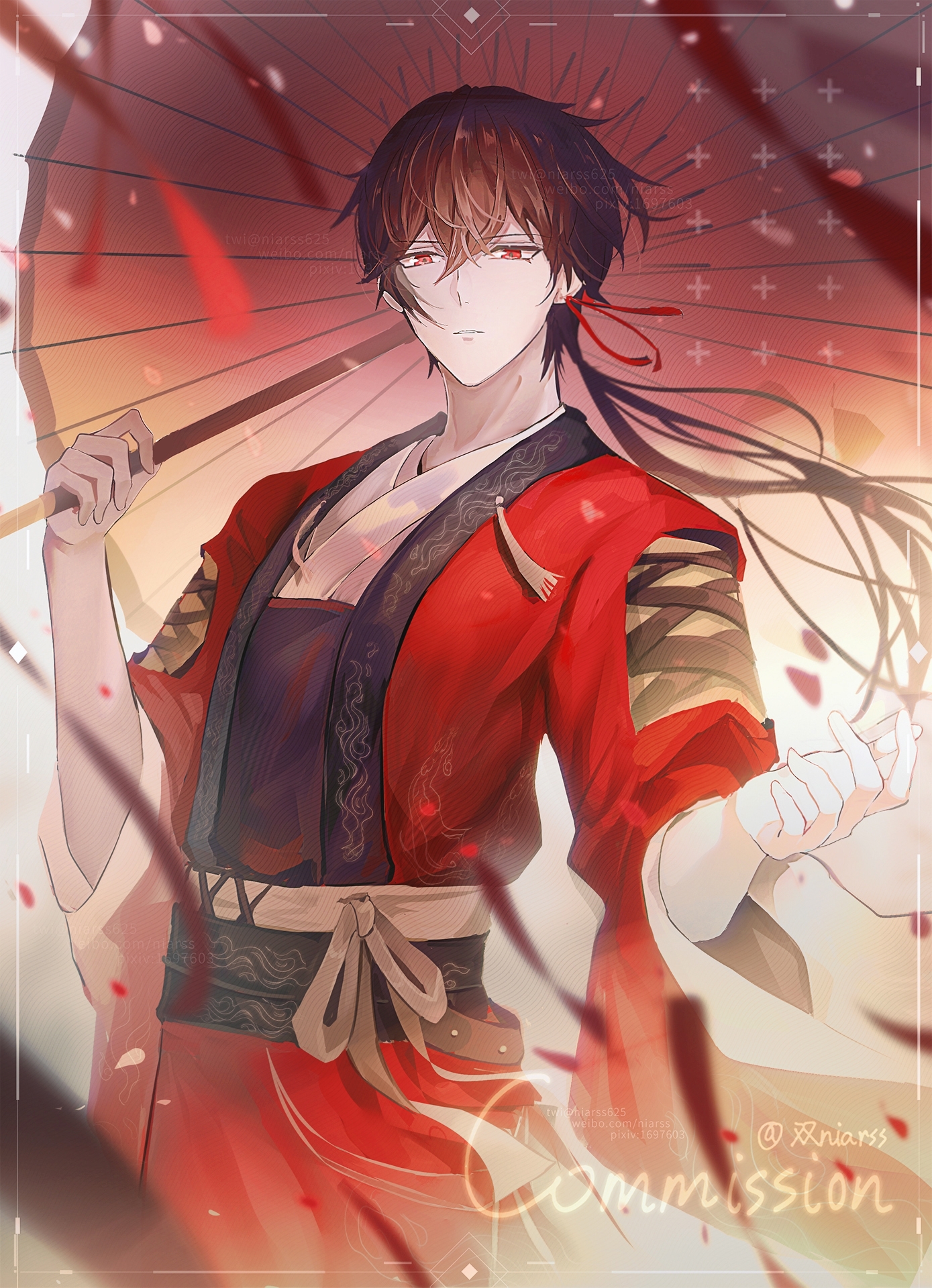 1boy ayn_alwyn black_hair black_sash blurry chinese_clothes chinese_commentary closed_mouth commission cowboy_shot cross-laced_clothes cross-laced_sleeves depth_of_field duijin_ruqun earrings expressionless falling_petals hair_between_eyes hand_up hanfu highres holding holding_umbrella jewelry long_hair looking_at_viewer lovebrush_chronicles low_ponytail male_focus neck_tassel niarss oil-paper_umbrella petals ponytail red_eyes red_hanfu red_ribbon red_umbrella ribbon ribbon_earrings sash single_earring solo standing streamers tassel three-quarter_sleeves umbrella waist_sash white_sash wide_sleeves