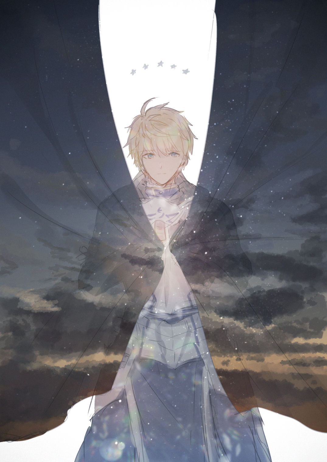 1boy ahoge armor arthur_pendragon_(fate) black_hood blonde_hair blue_eyes blue_robe breastplate closed_mouth cloud cloudy_sky cowboy_shot curtains ebi_(6_5) fate/grand_order fate_(series) faulds full_armor gauntlets hair_between_eyes highres holding looking_at_viewer male_focus pauldrons robe short_hair shoulder_armor simple_background sky solo standing star_(symbol) white_armor white_background