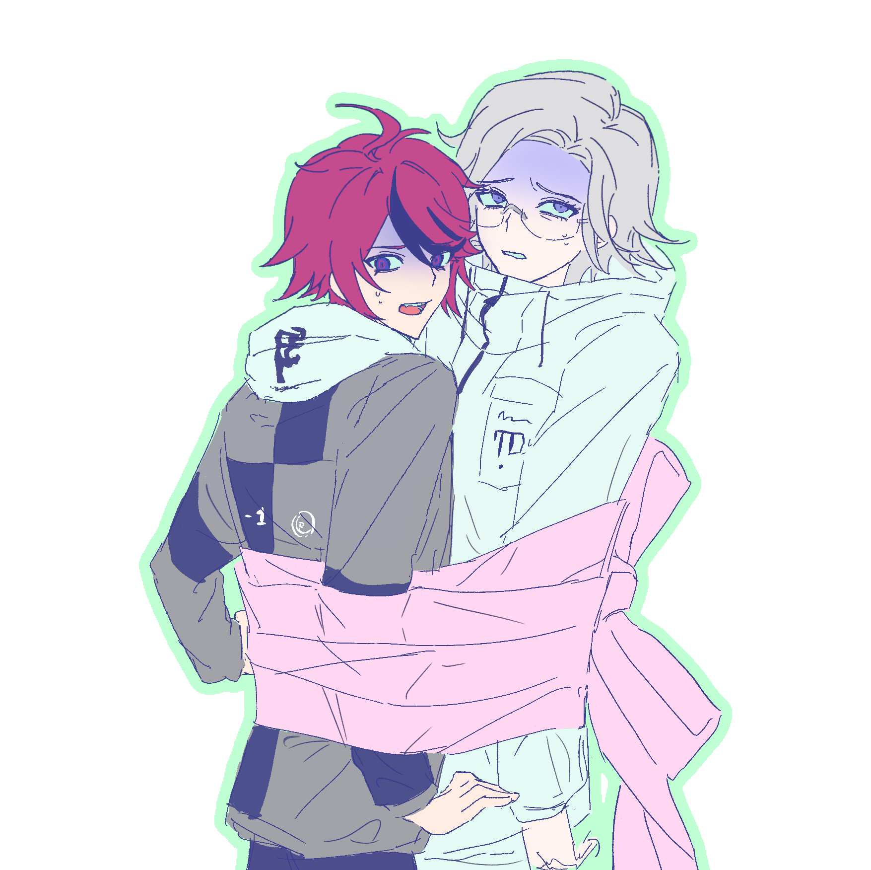 2boys aotsuki_eito baixi397 black_streaks blue_eyes blue_jacket bound bound_arms bow breast_pocket chinese_commentary commentary_request glasses green_outline grey_hair grey_jacket grimace highres hood hoodie jacket jacket_over_hoodie looking_at_viewer looking_up male_focus multicolored_hair multicolored_jacket multiple_boys nervous_sweating outline pink_bow pink_ribbon pocket purple_eyes red_hair ribbon ringed_eyes shaded_face short_hair simple_background streaked_hair sumino_takumi sweat the_hundred_line_-last_defense_academy- two-tone_jacket upper_body white_background white_hoodie white_jacket