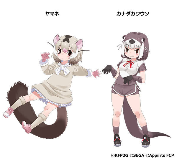2girls animal_ears brown_hair copyright_name doormouse_(kemono_friends) dress extra_ears full_body game_cg gloves grey_hair kemono_friends kemono_friends_3 looking_at_viewer multiple_girls north_american_river_otter_(kemono_friends) official_art shirt shoes short_hair shorts simple_background socks tail yoshizaki_mine_(style)
