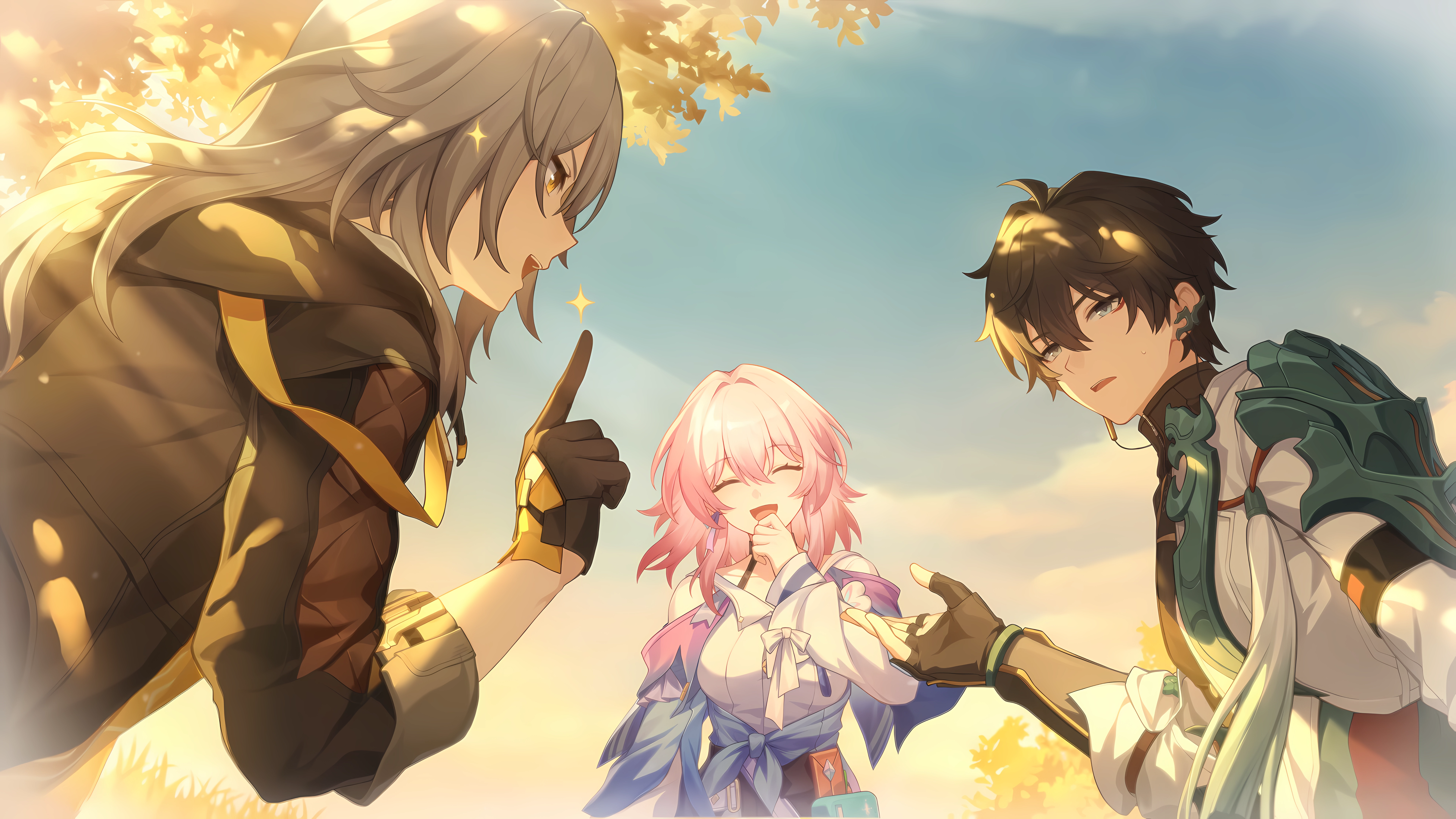 1boy 2girls absurdres ahoge autumn_leaves bad_link bad_miyoushe_link black_gloves black_hair black_jacket black_shirt blue_eyes blue_jacket blue_sky breasts camera closed_eyes dan_heng_(honkai:_star_rail) dan_heng_(hunt)_(honkai:_star_rail) dappled_sunlight ear_piercing earrings eyeliner fingerless_gloves game_cg gloves grey_hair hair_between_eyes hair_intakes hand_on_own_chin highres honkai:_star_rail honkai_(series) jacket jewelry leaf long_hair long_sleeves looking_at_another makeup march_7th_(honkai:_star_rail) march_7th_(preservation)_(honkai:_star_rail) medium_breasts medium_hair multiple_girls off_shoulder official_art open_mouth piercing pink_hair red_eyeliner shirt short_hair single_earring sky smile stelle_(honkai:_star_rail) sunlight trailblazer_(honkai:_star_rail) white_jacket white_shirt yellow_eyes