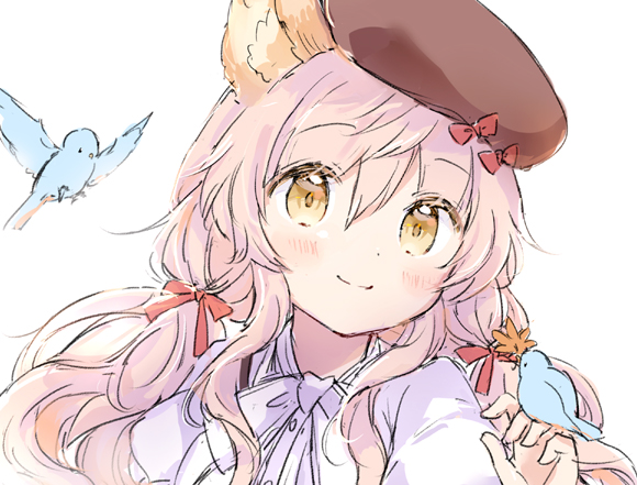 1girl animal animal_ear_fluff animal_ears animal_on_hand beret bird blush bow brown_eyes brown_hat closed_mouth commentary_request hair_bow hat hat_bow long_hair looking_at_viewer original pink_hair puffy_sleeves red_bow shirt simple_background smile solo unfinished upper_body wataame27 white_background white_shirt wolf-chan_(wataame27) wolf_ears