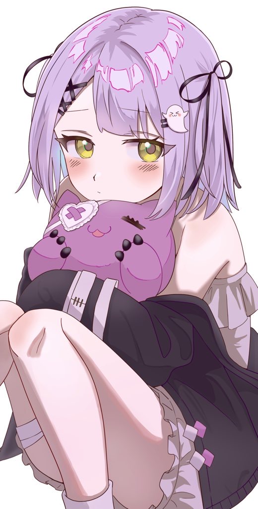 1girl black_jacket black_ribbon blush closed_mouth commentary_request ghost_hair_ornament hair_ornament hair_ribbon hair_tie jacket looking_at_viewer melomelo2468 off_shoulder purple_hair ribbon shinomiya_runa shinomiya_runa_(1st_costume) shirt sitting solo stuffed_animal stuffed_toy virtual_youtuber vspo! white_background x_hair_ornament yellow_eyes