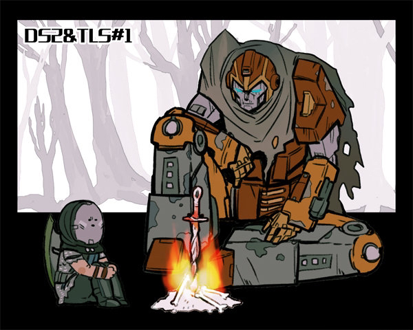 1other ambiguous_gender armor bearer_of_the_curse bonfire_(dark_souls) chainmail character_request commentary crossover dark_souls_(series) dark_souls_ii fire forest full_body kanon_(rsl) mask masked mecha nature robot rodimus rodimus_prime shield shield_on_back sitting transformers