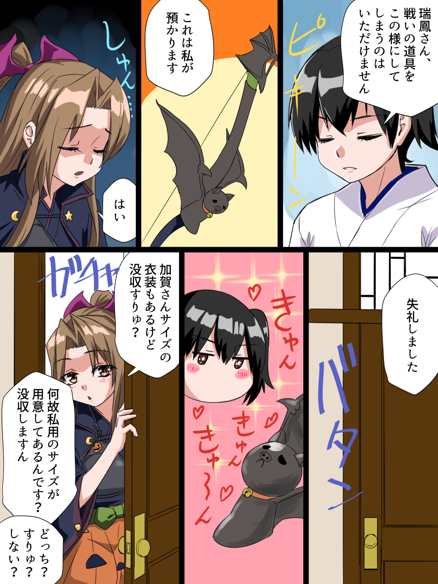 2girls black_kimono bow_(weapon) brown_hair closed_eyes commentary_request door hair_intakes hair_ornament halloween_costume highres jack-o'-lantern_print japanese_clothes kaga-(kancolle) kaga_(kancolle) kantai_collection kimono long_hair multiple_girls muneate nekotarou_(nktr299) orange_shorts pumpkin_shorts shorts side_ponytail translation_request weapon wing_hair_ornament zuihou_(halloween)_(kancolle) zuihou_(kancolle)