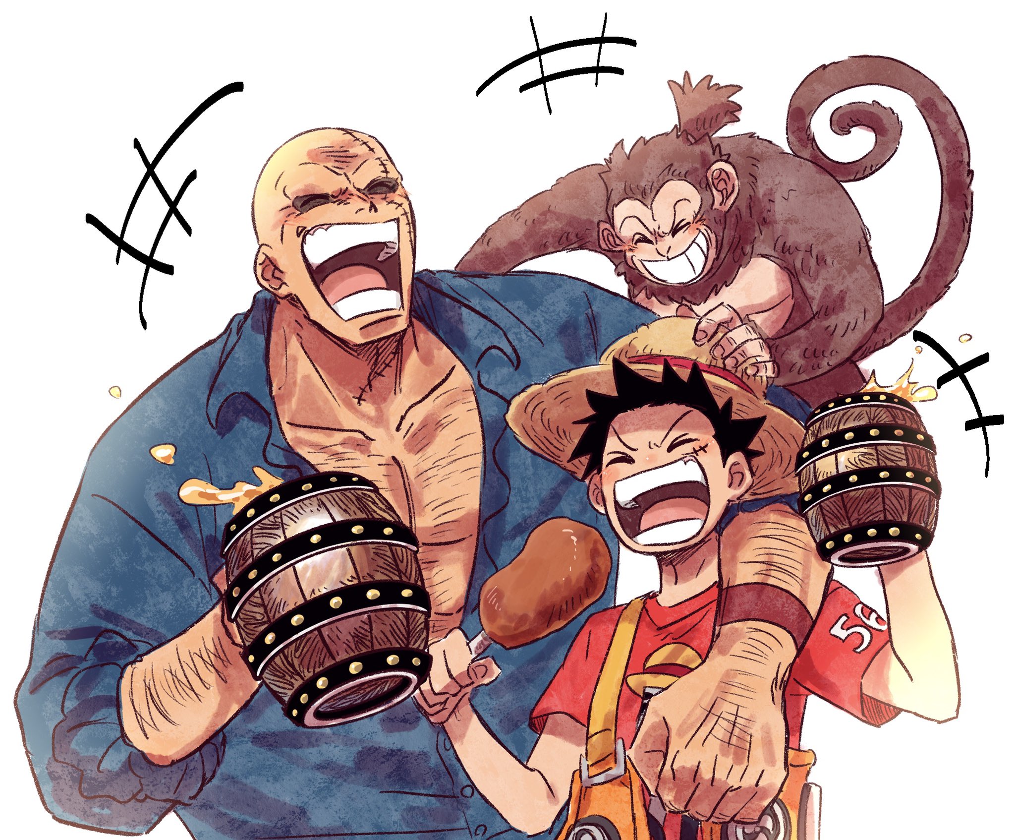 3boys ^_^ animal arm_up bald black_hair bonk_punch choko_egg closed_eyes drink food happy hat highres holding holding_drink holding_food hug laughing monkey monkey_d._luffy monster_(one_piece) multiple_boys one_piece pectorals short_hair shorts simple_background smile straw_hat white_background