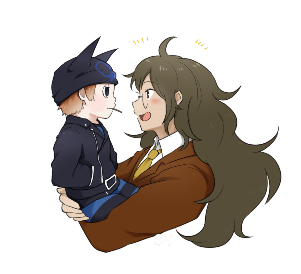 2boys :3 ahoge beanie belt belt_buckle black_belt black_eyes black_hat black_jacket black_pants blazer blue_pants blue_shirt brown_hair brown_jacket buckle buttons cigarette closed_mouth collared_jacket collared_shirt commentary_request cropped_legs cropped_torso danganronpa_(series) danganronpa_v3:_killing_harmony dark-skinned_male dark_skin face-to-face fake_horns from_side glasses gokuhara_gonta green_hair hands_in_pockets happy hat height_difference horned_headwear horns hoshi_ryoma jacket lapels leather leather_jacket lifting_person light_blush light_smile long_hair male_focus messy_hair mouth_hold multiple_boys necktie notched_lapels notice_lines open_mouth pants pocket pointy_nose print_headwear r'l_(arul-erur-plant-403) red_eyes round_eyewear shirt short_hair short_male simple_background smile striped_clothes striped_pants striped_shirt two-tone_pants v-neck white_background white_shirt yellow_necktie zipper