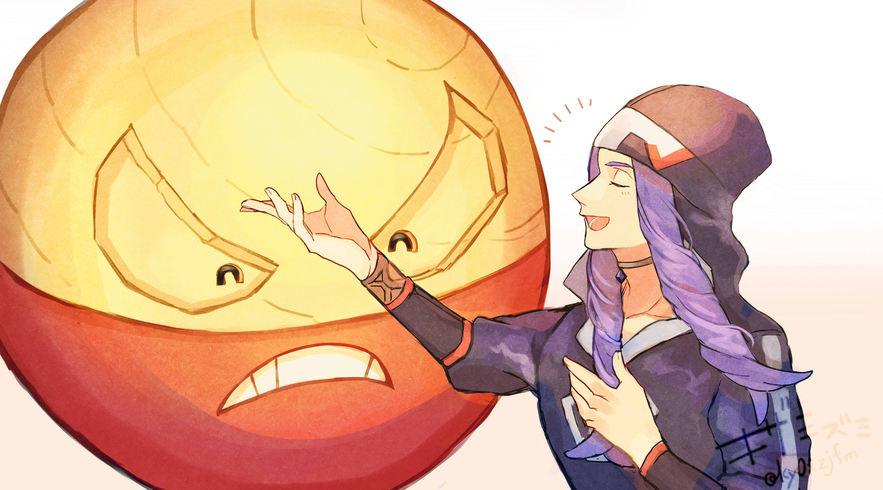 1boy beanie blue_hair blue_hat closed_eyes commentary_request diamond_clan_outfit eyelashes hat highres hisuian_electrode kizami_(hetaisi) long_hair long_sleeves lower_teeth_only male_focus melli_(pokemon) nintendo open_mouth pokemon pokemon_legends:_arceus simple_background smile teeth white_background