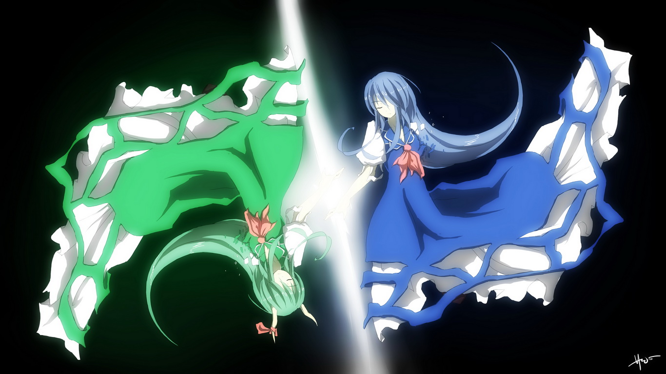 2girls ascot black_background blue_dress blue_hair closed_eyes collared_shirt dress green_dress green_hair halozy hollowwings horns kamishirasawa_keine kamishirasawa_keine_(hakutaku) light_rays long_hair multiple_girls orange_ascot osu! shirt touhou upside-down