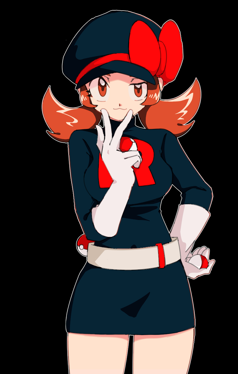 1girl black_background black_dress black_hat bow brown_eyes brown_hair closed_mouth dress gloves hand_on_own_hip hat hat_bow highres holding holding_poke_ball looking_at_viewer lyra_(pokemon) newsboy_cap nintendo outline poke_ball poke_ball_(basic) pokemon pokemon_heartgold_and_soulsilver r7defdupyt83820 red_bow solo team_rocket team_rocket_uniform twintails w w_over_mouth white_gloves white_outline