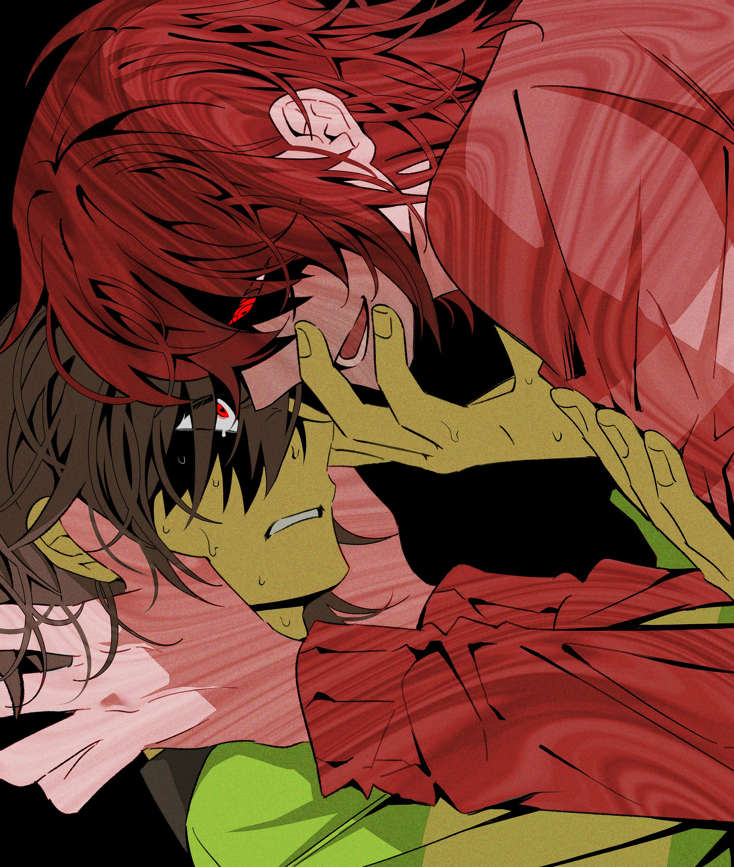 2others absurdres brown_hair colored_skin commentary_request deltarune green_shirt hands_on_another's_face highres korean_commentary kris_(deltarune) long_sleeves multiple_others open_mouth other_focus red_eyes ringed_eyes shirt striped_clothes sweat utdr_(toby_fox) vessel_(deltarune) yellow_skin yp_katelove