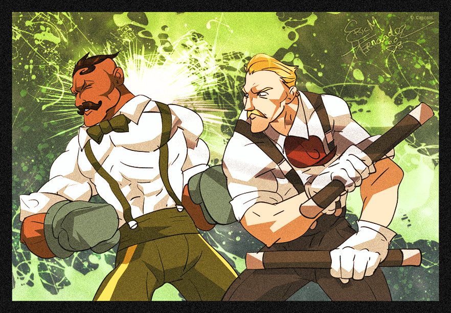 2boys baton_(weapon) battle blonde_hair bow bowtie boxing_gloves clothing_cutout dark-skinned_male dark_skin dudley eagle_(street_fighter) electricdawgy facial_hair gloves green_background leg_cutout male_focus multiple_boys muscular muscular_male mustache necktie shirt signature street_fighter street_fighter_iii_(series) suspenders united_kingdom weapon white_gloves white_shirt