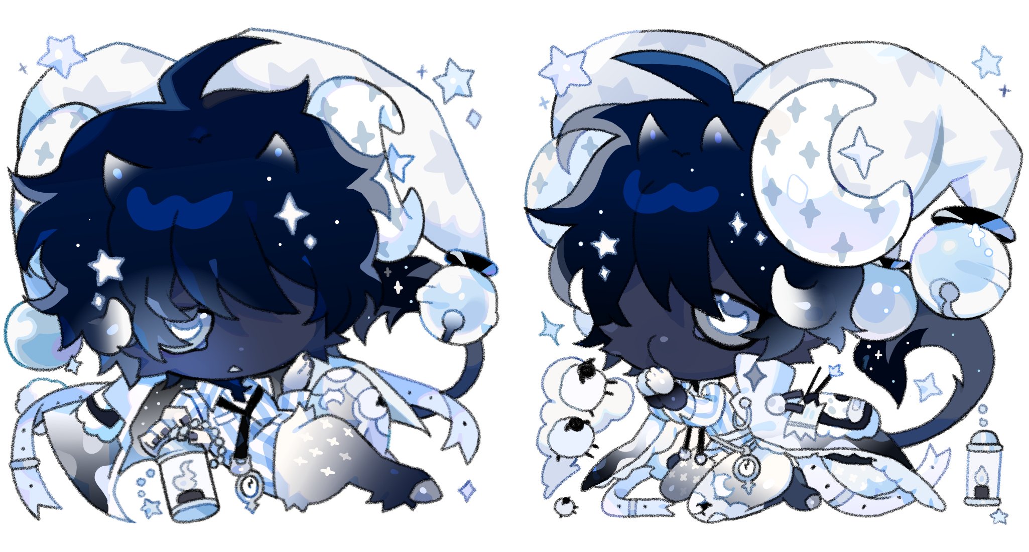 1boy adoptable animal_feet blue_fur blue_hair body_fur capelet chibi colored_sclera commentary crescent-shaped_pupils dilnyan03 english_commentary full_body furry furry_male grey_sclera hat high_collar highres hooves horns jester_cap male_focus multiple_views original pocket_watch praying shirt short_hair simple_background striped_clothes striped_shirt symbol-shaped_pupils tail watch white_background white_capelet white_eyes