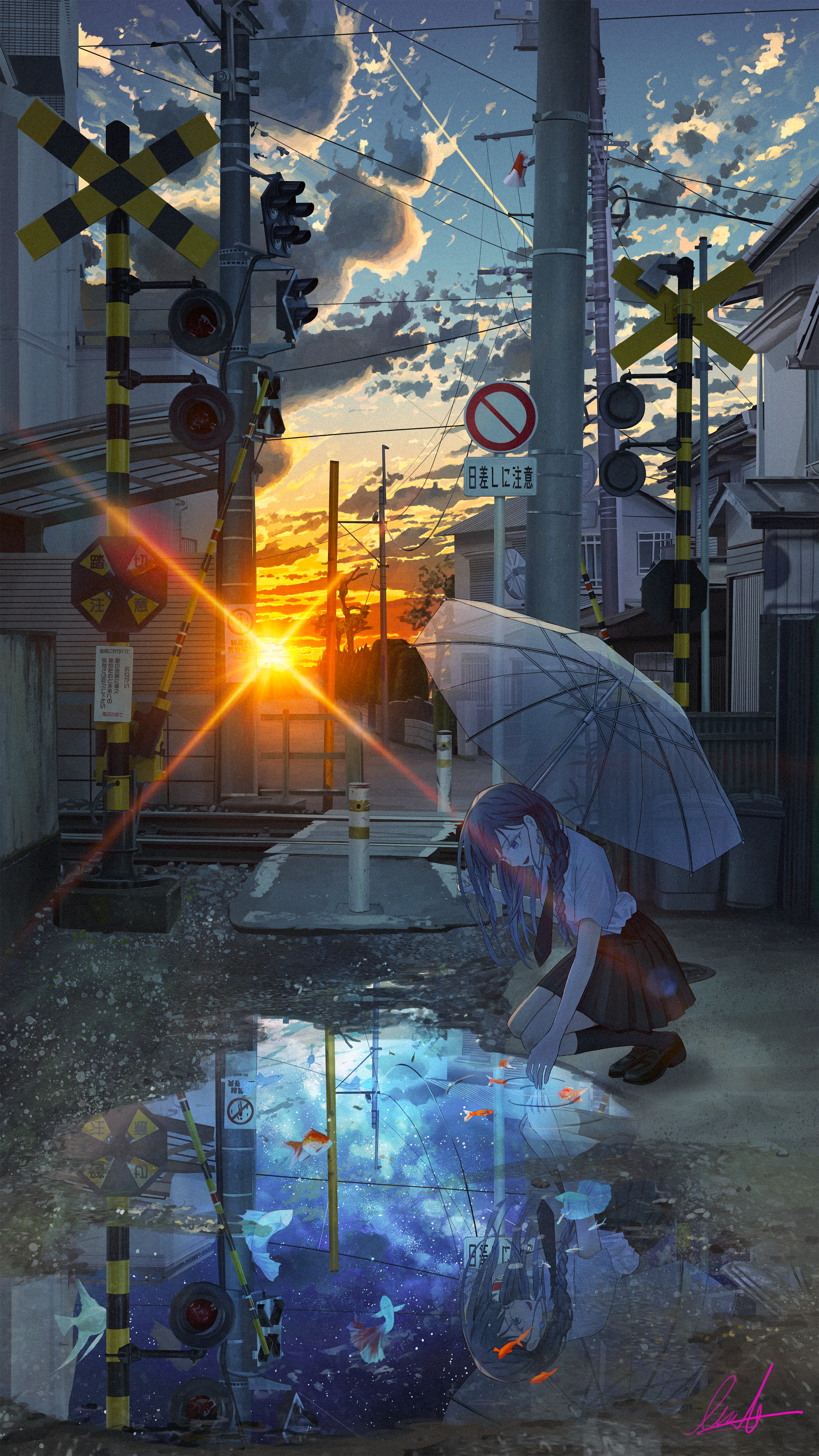 1girl absurdres banishment black_hair black_sailor_collar black_skirt black_socks blue_sky building cloud evening fantasy fish gradient_sky highres holding holding_umbrella orange_sky original outdoors pleated_skirt puddle railroad_crossing railroad_tracks reflection sailor_collar scenery school_uniform shirt short_sleeves skirt sky socks squatting sun sunset umbrella white_shirt