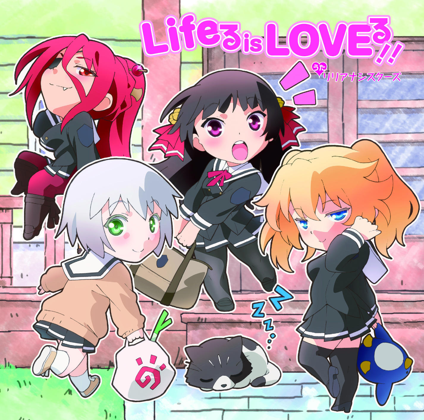 4girls album_cover artist_request bag bell black_dress black_hair blonde_hair blue_eyes boots breasts brown_boots cat chibi closed_mouth commentary_request cover dress eyepatch fang fang_out glint grey_hair hair_bell hair_ornament high_heels highres himenokouji_akiko holding holding_bag holding_stuffed_toy knee_up kneehighs large_breasts long_hair long_sleeves looking_at_viewer looking_back medium_breasts multiple_girls nasuhara_anastasia neck_ribbon nikaidou_arashi official_art onii-chan_dakedo_ai_sae_areba_kankeinai_yo_ne open_mouth pantyhose pink_eyes plastic_bag pleated_skirt ponytail red_eyes red_hair ribbon sawatari_ginbee_haruomi school_bag school_uniform shirt sitting skirt smile socks standing standing_on_one_leg stuffed_animal stuffed_penguin stuffed_toy teeth thighhighs upper_teeth_only white_socks zzz