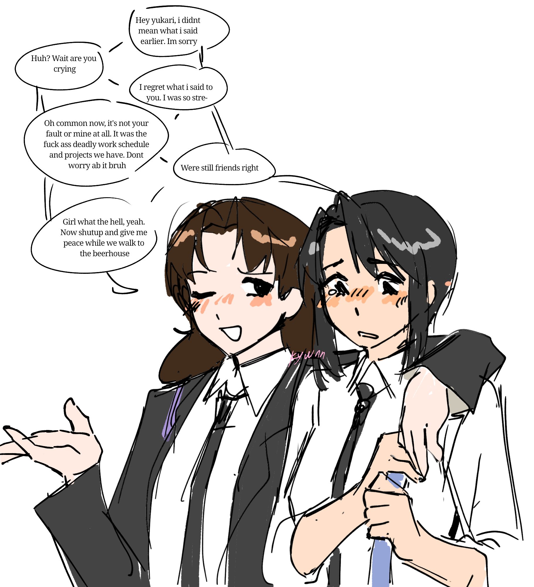 2girls arm_around_shoulder azumanga_daiou black_hair black_pants brown_hair commentary crying crying_with_eyes_open english_commentary english_text highres kurosawa_minamo kyuunn long_hair long_sleeves medium_hair multiple_girls one_eye_closed open_mouth pants shirt tanizaki_yukari tearing_up tears white_background white_shirt yuri