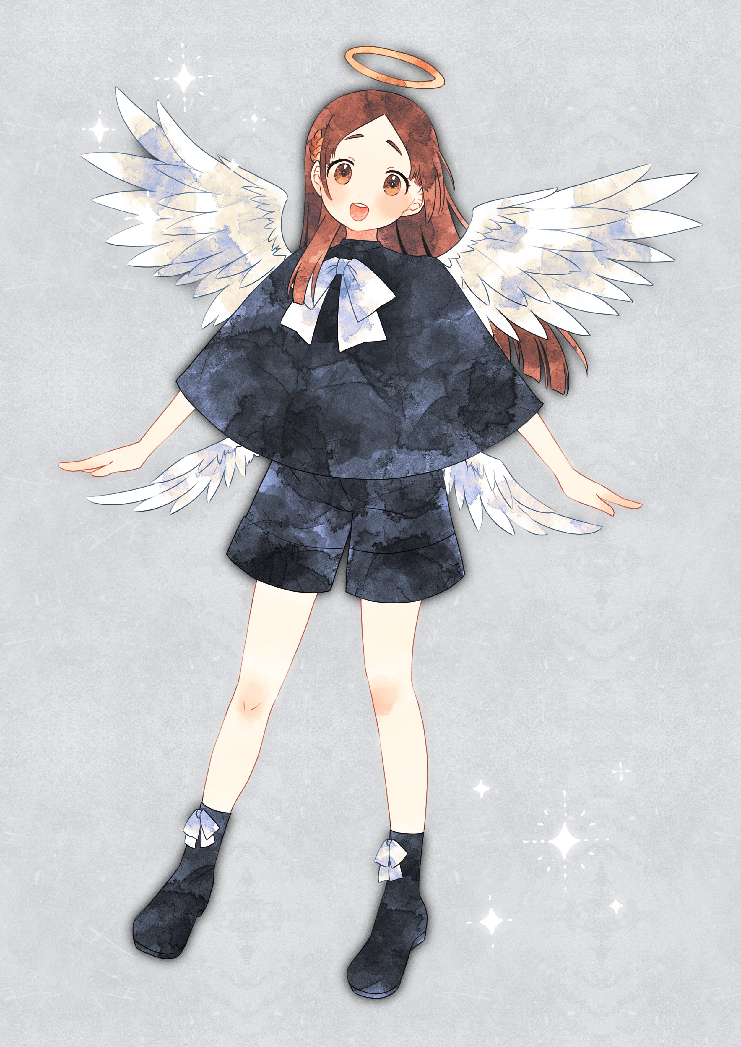 1girl absurdres angel angel_wings black_boots black_cloak black_shorts blunt_ends boots bow bowtie brown_eyes brown_hair cloak commentary_request feathered_wings full_body gakuen_idolmaster grey_background hair_ornament halo highres idolmaster kemi_(0potecat0) kuramoto_china laurels leaf_hair_ornament long_hair looking_at_viewer low_wings open_mouth outstretched_arms parted_bangs shorts solo sparkle standing traditional_halo white_bow white_bowtie white_wings wings