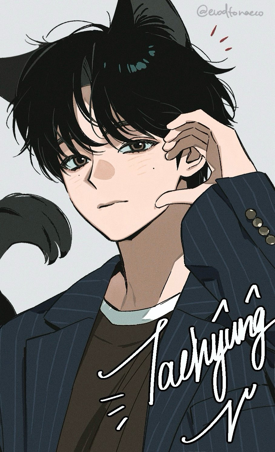 1boy animal_ears black_hair black_shirt blue_jacket brown_eyes cat_boy cat_ears cat_tail closed_mouth evodtonaeco hand_up heart heart_hands highres jacket long_sleeves looking_at_viewer male_focus mole mole_under_eye notice_lines open_clothes open_jacket original parted_bangs shirt simple_background striped_clothes tail twitter_username