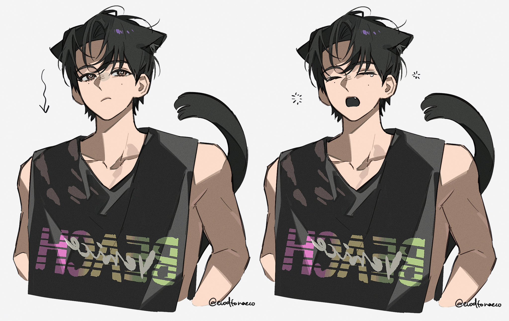 1boy animal_ears black_hair black_shirt brown_eyes cat_boy cat_ears cat_tail closed_mouth collarbone evodtonaeco highres looking_at_viewer male_focus multiple_expressions multiple_views open_mouth original parted_bangs shirt short_hair simple_background sleepy sleeveless tail twitter_username upper_body yawning
