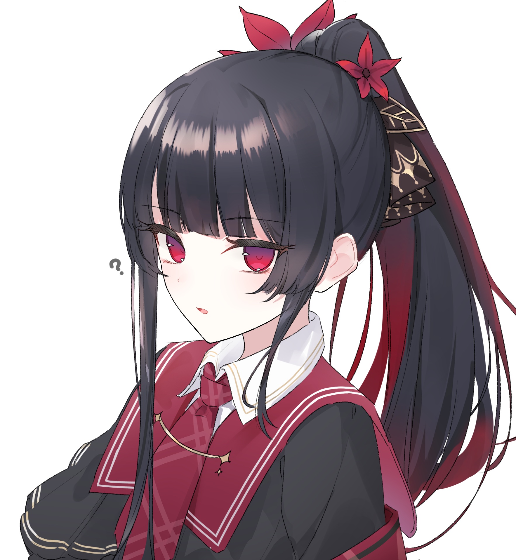 1girl ? alternate_hairstyle black_dress black_hair colored_inner_hair dress flower hair_flower hair_ornament highres hime_cut ise_dango looking_at_viewer magical_girl mahou_shoujo_no_majo_saiban multicolored_hair nikaido_hiro parted_lips ponytail red_eyes red_flower simple_background solo white_background