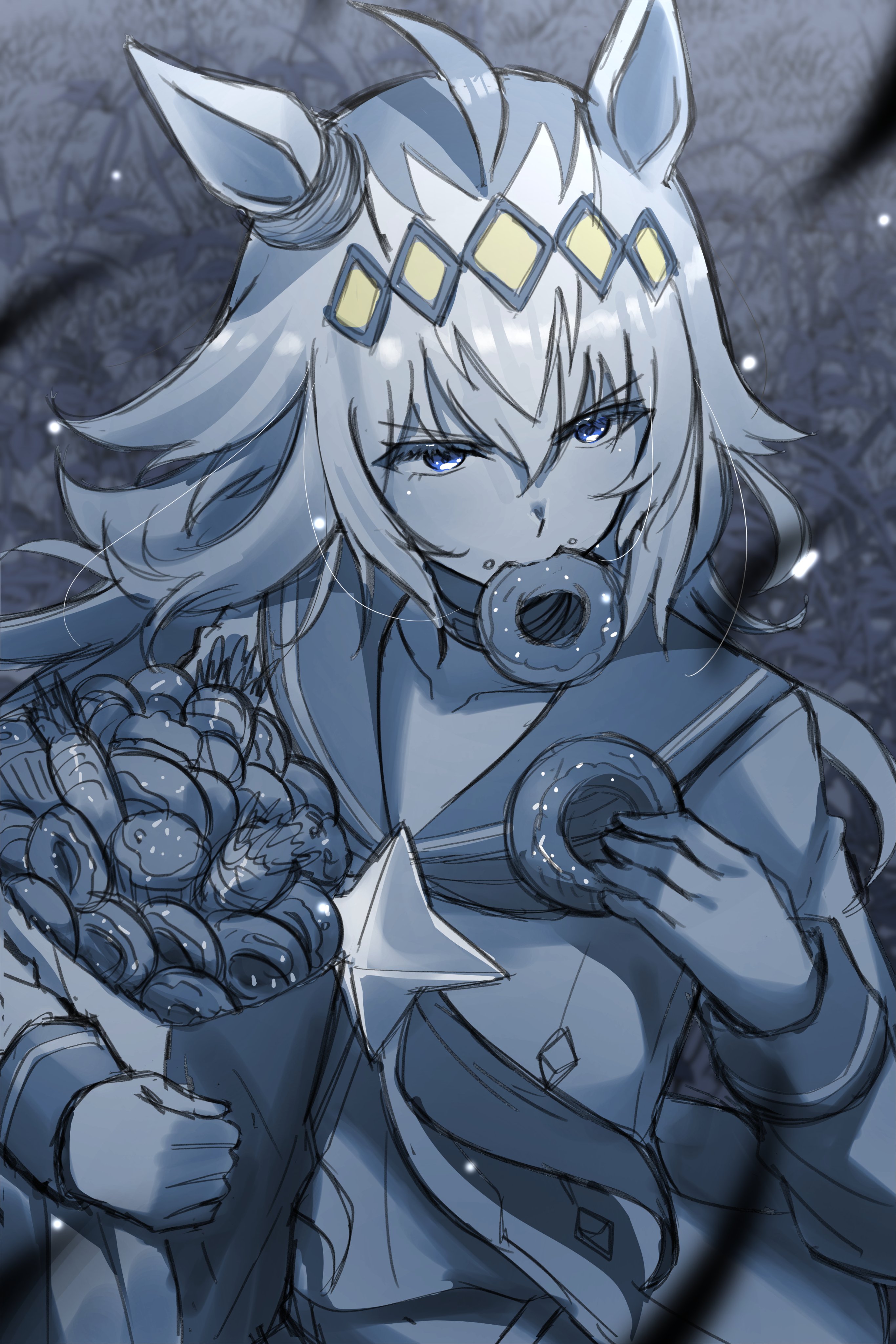 1girl absurdres ahoge animal_ears bag blue_eyes carrot donut eating food food_in_mouth grass highres holding holding_bag holding_donut holding_food horse_ears kay_yu long_hair oguri_cap_(starlight_beat)_(umamusume) oguri_cap_(umamusume) paper_bag sailor_collar spot_color umamusume