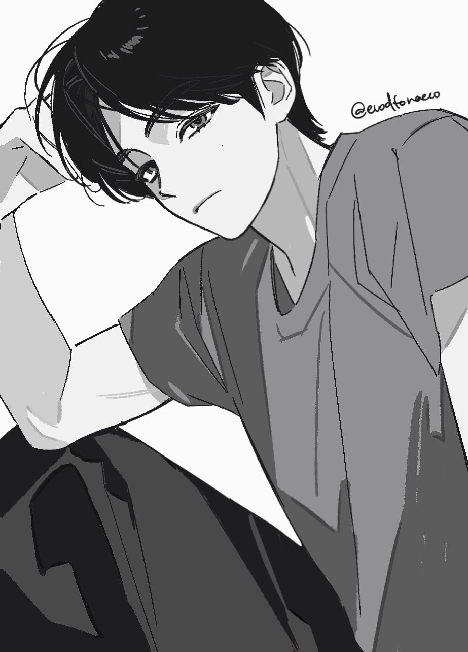1boy black_hair black_pants closed_mouth evodtonaeco greyscale highres knees_up looking_at_viewer male_focus mole mole_under_eye monochrome original pants parted_bangs shirt short_hair short_sleeves simple_background sitting solo t-shirt twitter_username