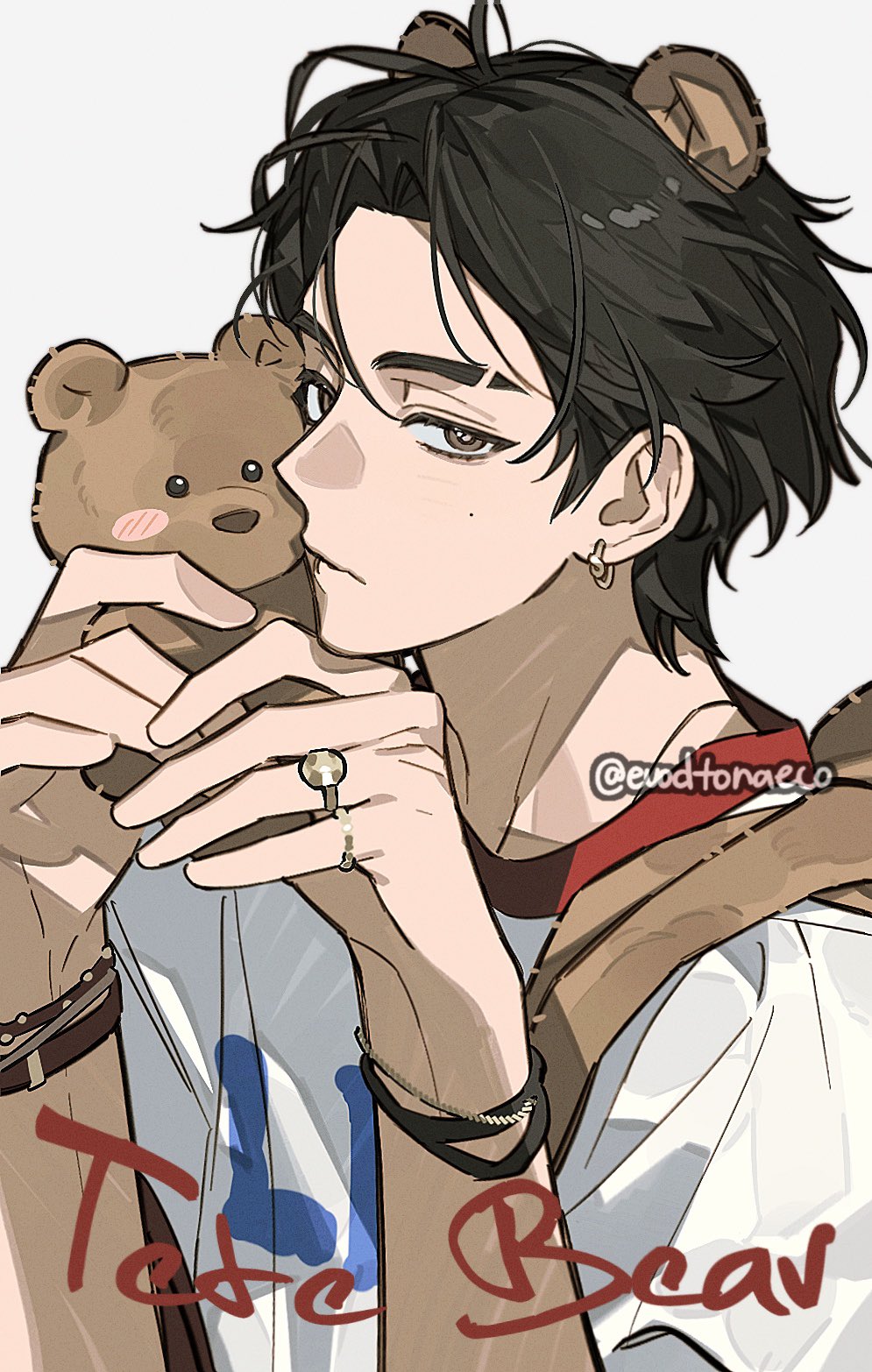 1boy animal_ears bear_ears bracelet brown_eyes brown_hair closed_mouth earrings english_text evodtonaeco fake_animal_ears hands_up highres holding jewelry looking_at_viewer male_focus mole multiple_rings original parted_bangs ring shirt short_hair short_sleeves simple_background solo stuffed_animal stuffed_toy teddy_bear twitter_username upper_body white_shirt