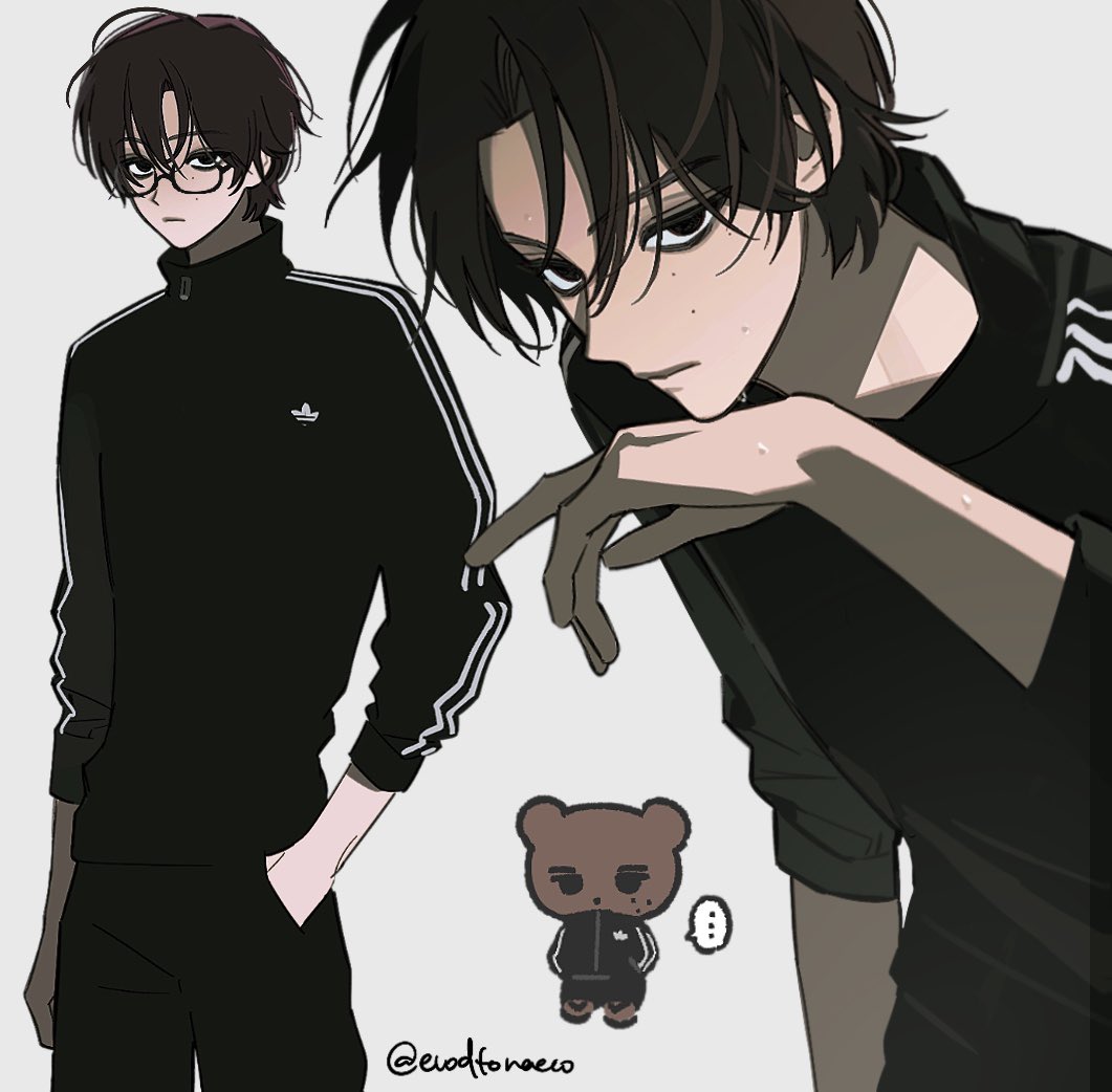 ... 1boy black_jacket brown_eyes brown_hair closed_mouth cowboy_shot evodtonaeco glasses hand_in_pocket hand_up jacket looking_at_viewer male_focus multiple_girls original pants parted_bangs shirt short_hair simple_background stuffed_animal stuffed_toy sweat teddy_bear twitter_username