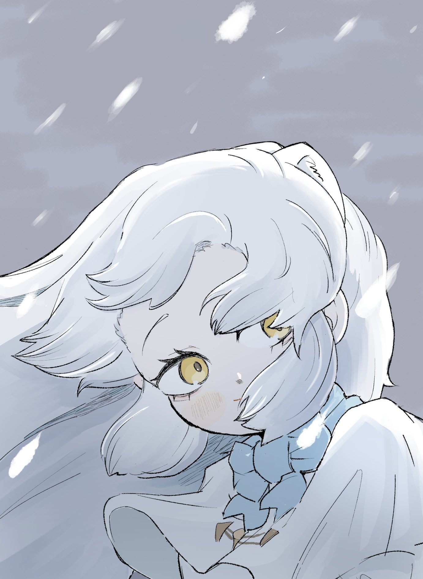1girl animal_ears arctic_fox_(kemono_friends) blue_bow blue_bowtie blush bow bowtie capelet coat floating_hair fox_ears fox_girl hair_between_eyes highres kemono_friends long_hair nenkou-san sidelocks snow snowing solo upper_body white_capelet white_coat white_hair yellow_eyes