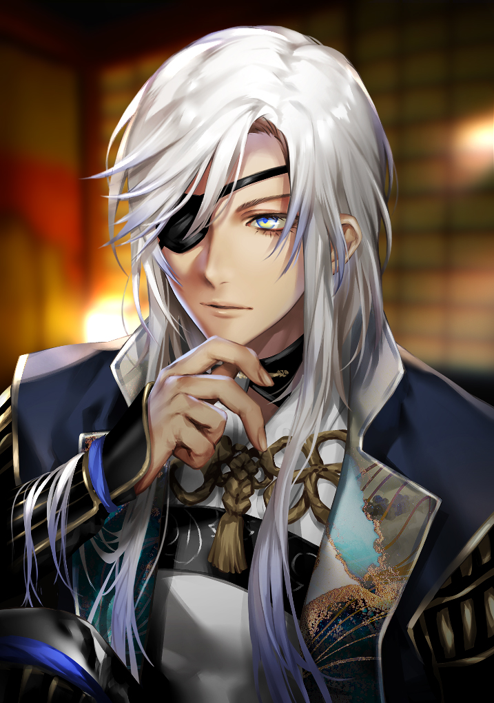 1boy akke_(akke299) arm_guards armor blue_eyes blue_jacket blurry blurry_background closed_mouth dark-skinned_male dark_skin depth_of_field eyelashes eyepatch gradient_hair hand_on_own_chin hand_up hat ibrahim_(3rd_costume)_(nijisanji) ibrahim_(nijisanji) indoors jacket japanese_clothes long_hair long_sleeves looking_at_viewer male_focus multicolored_hair nijisanji one_eye_covered shirt sidelocks solo swept_bangs tassel unworn_hat unworn_headwear upper_body virtual_youtuber white_hair white_shirt