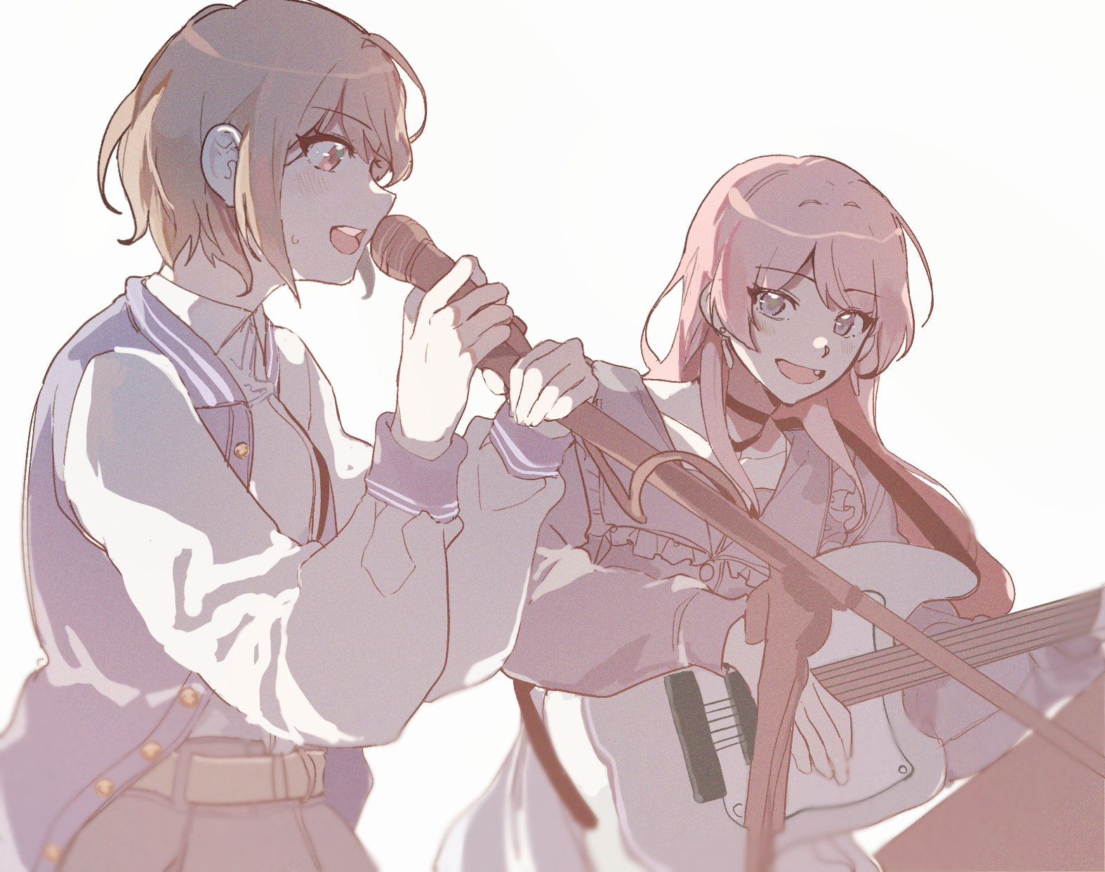 2girls bang_dream! bang_dream!_it's_mygo!!!!! blue_jacket blue_shirt chihaya_anon commentary_request earrings electric_guitar fang grey_eyes grey_hair guitar highres holding holding_microphone instrument jacket jewelry long_hair long_sleeves microphone microphone_stand multicolored_jacket multiple_girls music open_mouth pink_eyes pink_hair playing_guitar playing_instrument shirt short_hair simple_background singing smile suudori sweat takamatsu_tomori two-tone_jacket white_background white_jacket white_shirt