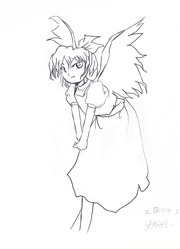 concept_art daiyousei dress embodiment_of_scarlet_devil fairy fairy_wings feet_out_of_frame greyscale majic_of_life monochrome ribbon touhou white_background wings zun_(artist)