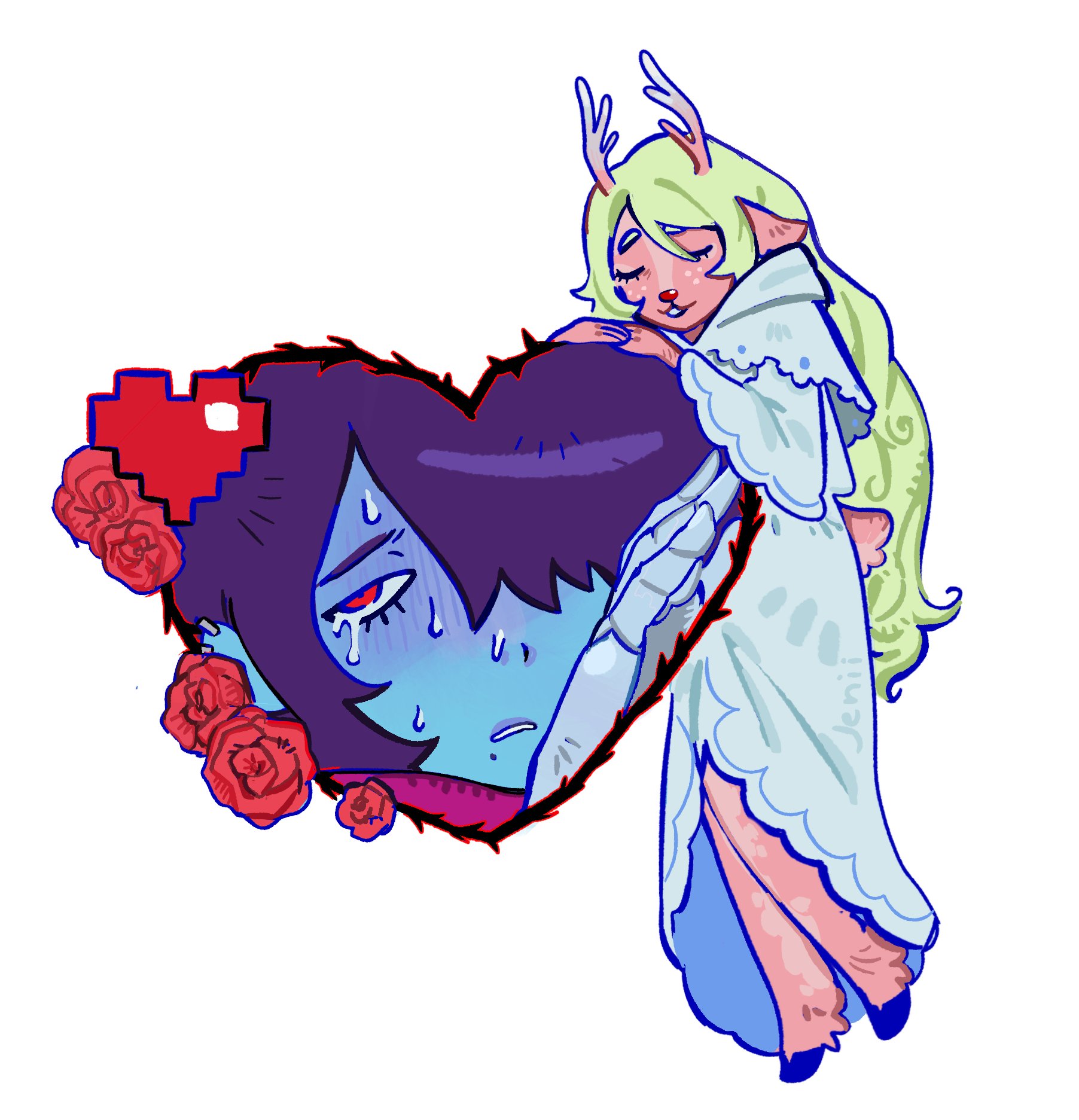 1girl 1other alien_stage antlers black_hair blonde_hair blue_skin capelet closed_eyes colored_skin commentary deer_antlers deer_girl deltarune derivative_work english_commentary flower furry furry_female hair_over_one_eye heart highres hood hooded_capelet hooves horns kris_(dark_world)_(deltarune) kris_(deltarune) long_hair mole mole_under_mouth noelle_holiday noelle_holiday_(dark_world) other_with_female pixel_heart red_eyes red_flower red_rose robe rose soul_(deltarune) susujenii sweat tears thorns utdr_(toby_fox) very_long_hair weird_route_(deltarune) white_capelet white_robe