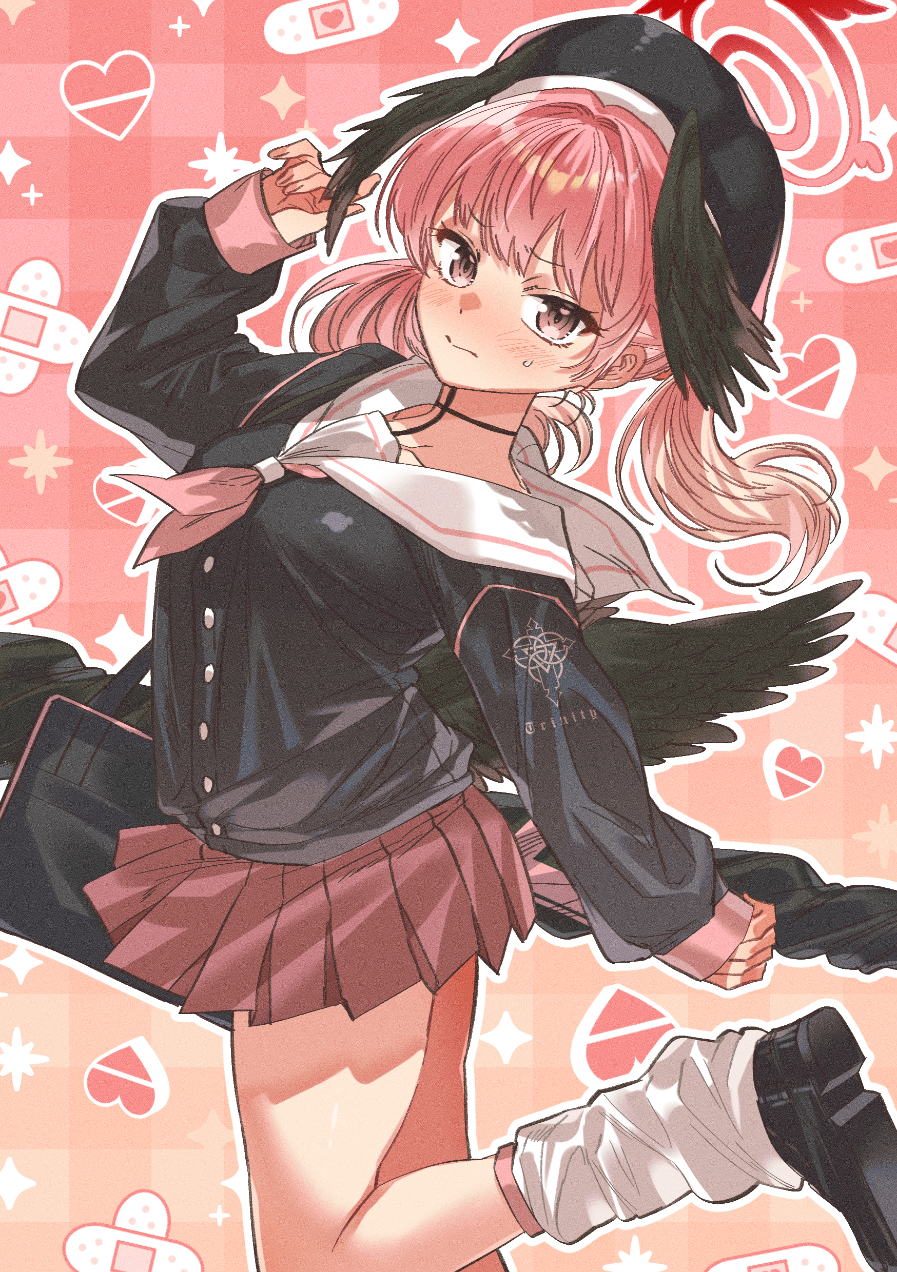1girl absurdres bag beret black_choker black_hat black_shirt black_shoes black_wings blue_archive blush choker closed_mouth commentary feathered_wings film_grain floating_hair foot_out_of_frame from_side frown furrowed_brow halo hand_up hat head_wings heart heart_background highres kneehighs koharu_(blue_archive) long_hair looking_at_viewer loose_socks low_wings miniskirt namaniku_(user_nxxf7457) neckerchief outline pink_background pink_eyes pink_hair pink_neckerchief pink_skirt pleated_skirt red_halo sailor_collar school_uniform serafuku shirt shoe_soles shoes shoulder_bag simple_background skirt sleeves_past_wrists socks solo sparkle split_mouth standing standing_on_one_leg sweatdrop thighs trinity_general_school_logo twintails white_outline white_sailor_collar white_socks wings