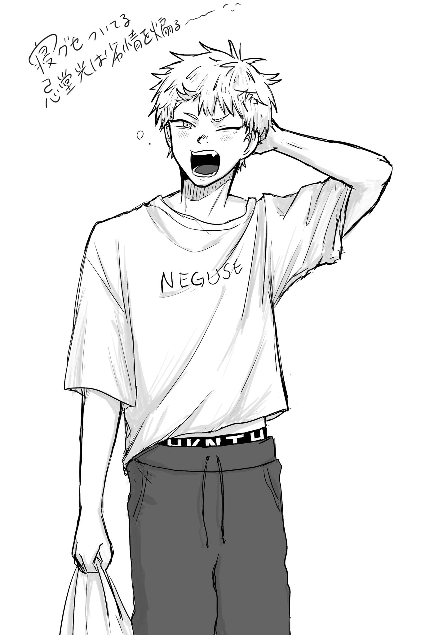 1boy arm_behind_head arm_up aynk_01 blush commentary_request cowboy_shot highres hikaru_ga_shinda_natsu holding indou_hikaru male_focus male_underwear male_underwear_peek messy_hair one_eye_closed open_mouth pants shirt simple_background solo teeth translation_request underwear white_background yawning