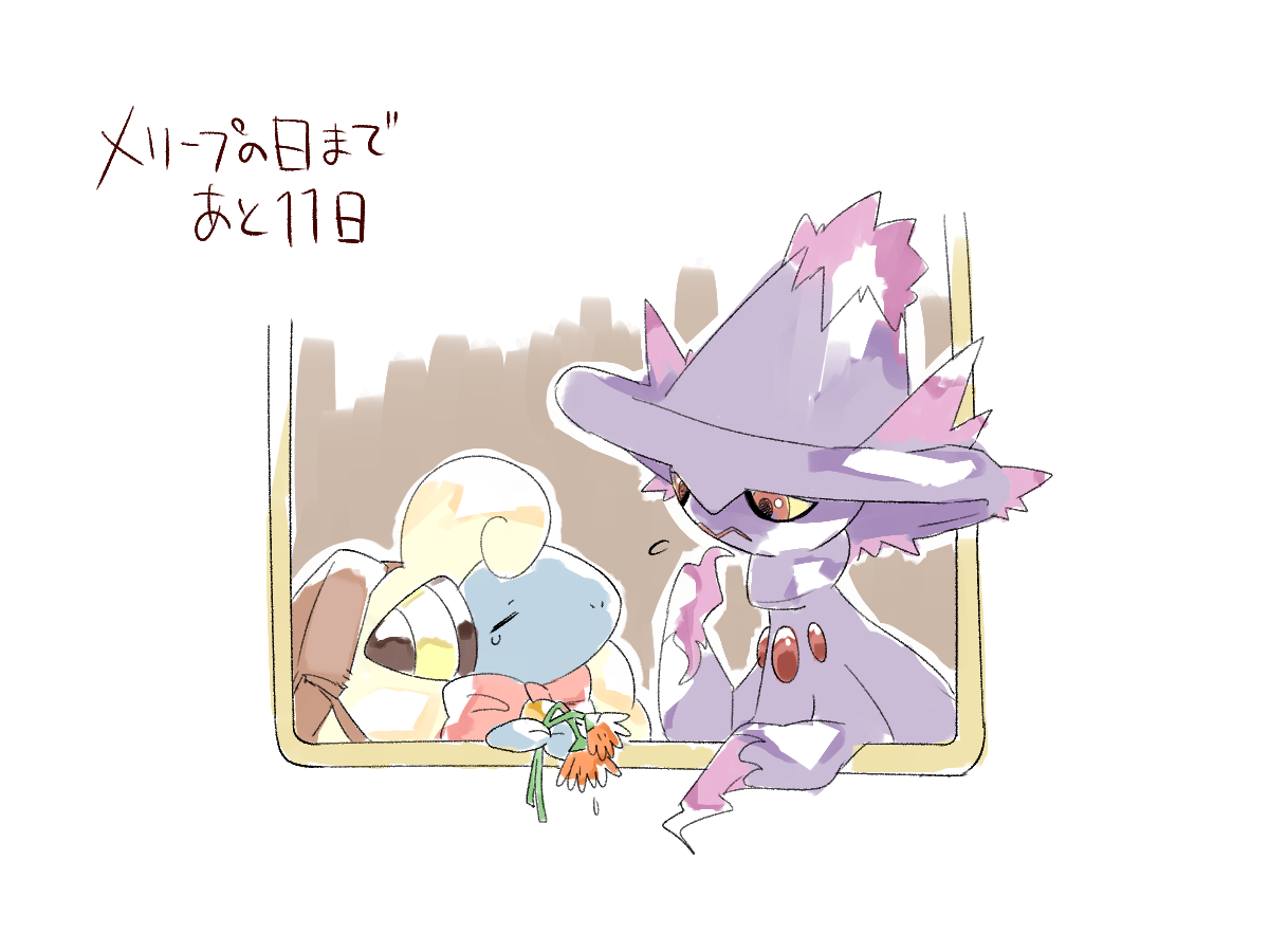 bag bow brown_bag closed_eyes colored_sclera flower gen_2_pokemon gen_4_pokemon kura_(shironagasu02) mareep mismagius nintendo pink_bow pokemon pokemon_(creature) red_eyes yellow_sclera