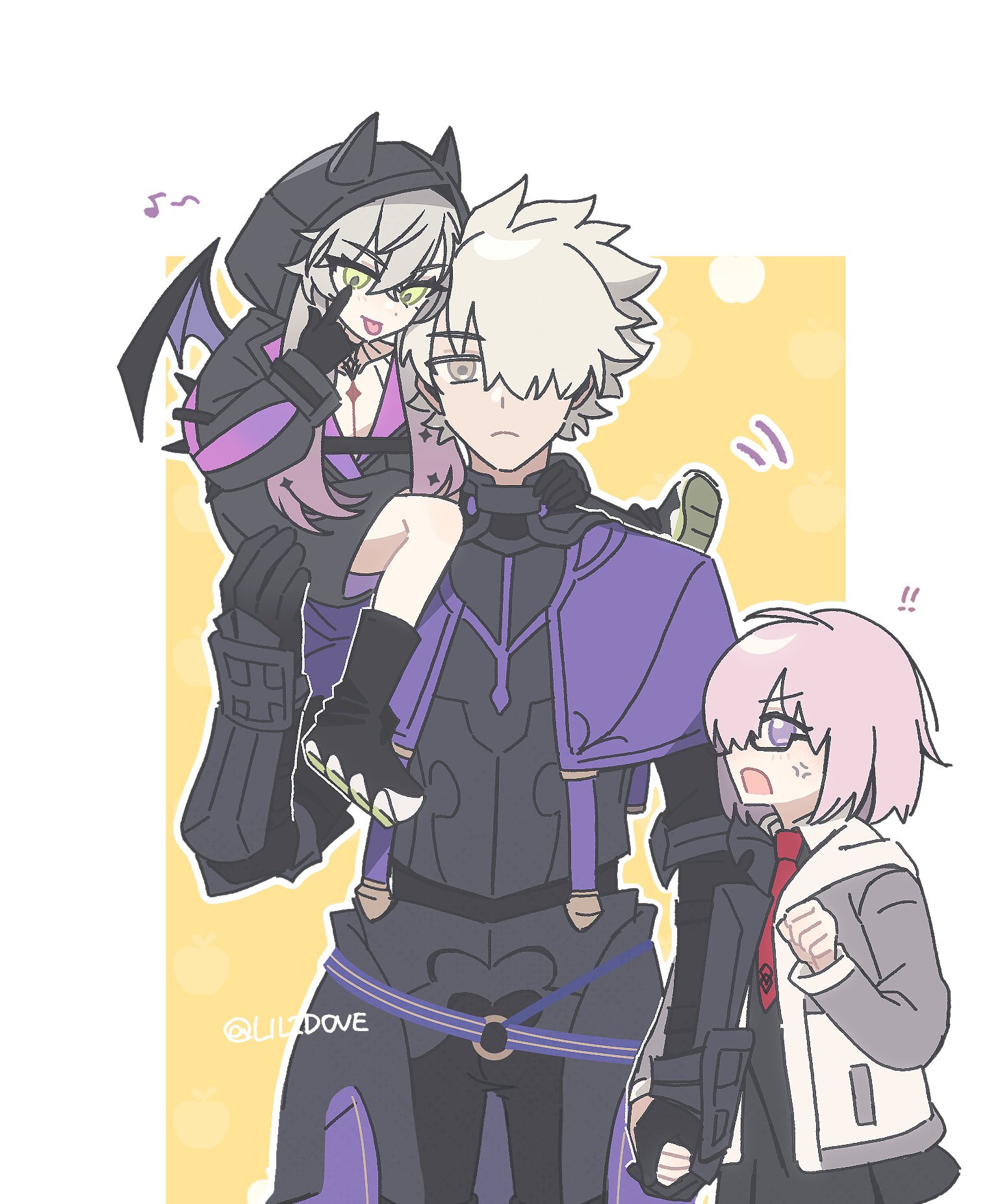 1boy 2girls anger_vein armor bat_wings chest_tattoo fate/grand_order fate_(series) galahad_(fate) glasses green_eyes grey_eyes highres hood hoodie jacket lil1dove lilith_(fate) lilith_(first_ascension)_(fate) mash_kyrielight multiple_girls necktie open_clothes open_jacket open_mouth purple_eyes red_necktie tattoo white_hair wings