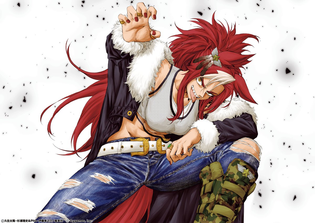 1girl animal_ears belt boots commentary_request crop_top debris denim ear_ornament fishnet_top fishnets fur-trimmed_jacket fur_trim horse_ears horse_girl horse_tail jacket jeans knee_boots kuzumi_taiyou long_hair long_sleeves looking_at_viewer multicolored_hair official_art open_clothes open_jacket pants piercing red_hair red_nails sharp_teeth solo stomach tail tank_top teeth thief_crow_(umamusume) tongue_piercing torn_clothes torn_jeans torn_pants umamusume umamusume:_cinderella_gray white_background white_belt white_tank_top yellow_eyes