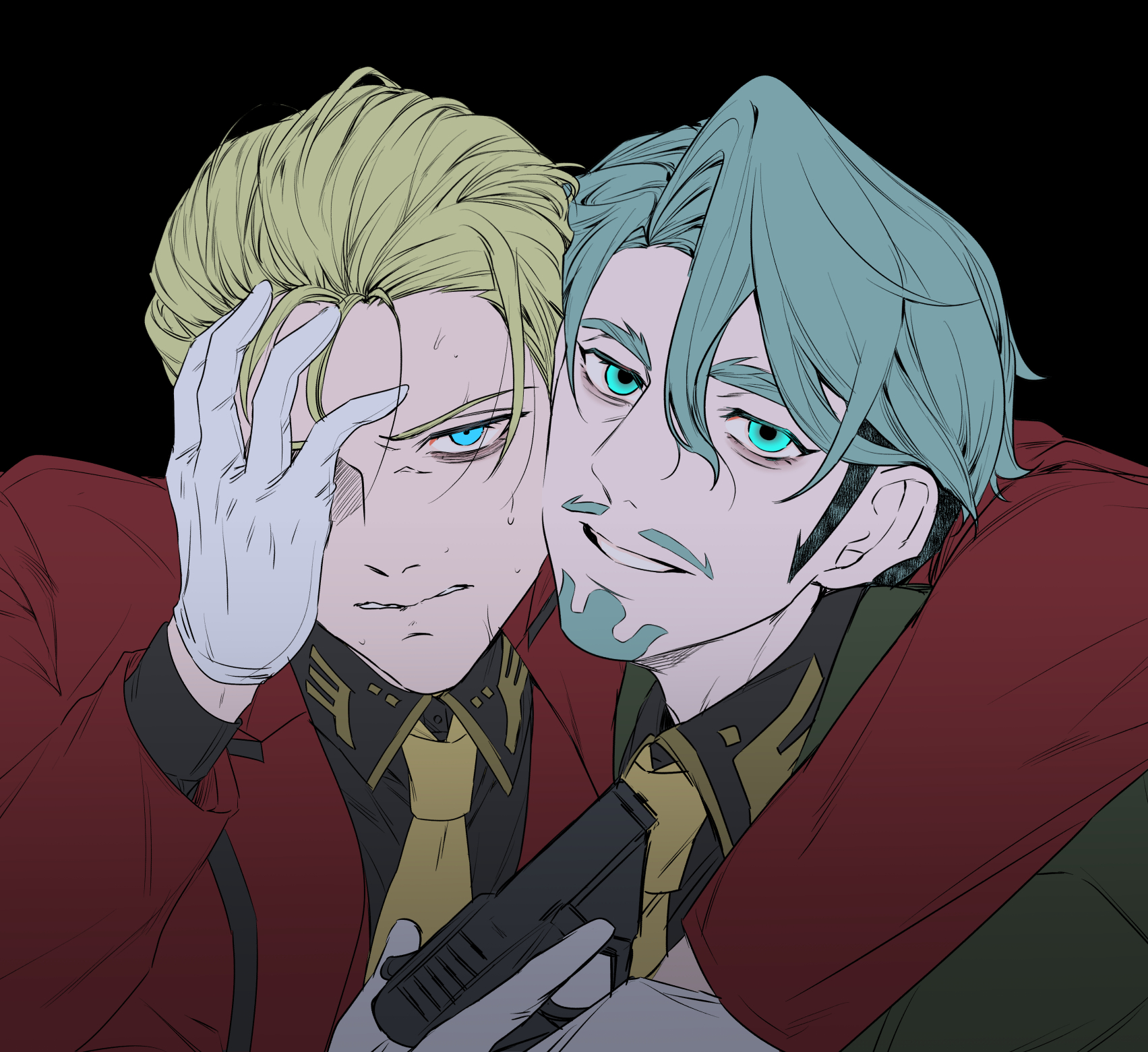 2boys arm_around_neck beard black_background blonde_hair blue_eyes challia_bull char_aznable clenched_teeth collared_shirt facial_hair gloves green_eyes green_hair gun gundam gundam_gquuuuuux hand_on_own_face handgun highres holding holding_gun holding_weapon jacket long_sleeves looking_at_viewer male_focus military_uniform multiple_boys mustache necktie open_mouth pnkripl shirt short_hair simple_background smile sweat teeth weapon