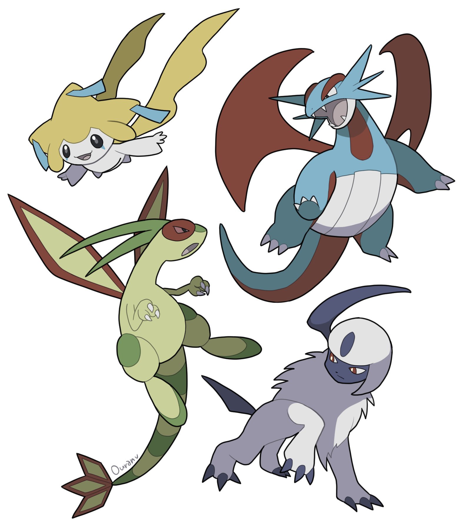 absol animal_focus claws closed_mouth colored_skin dragon fangs flygon full_body gen_3_pokemon green_wings highres horns jirachi legendary_pokemon mythical_pokemon nintendo no_humans open_mouth ouran pokemon pokemon_(creature) pokemon_focus red_eyes red_wings salamence simple_background single_horn smile tail tanzaku white_background white_fur white_skin wings