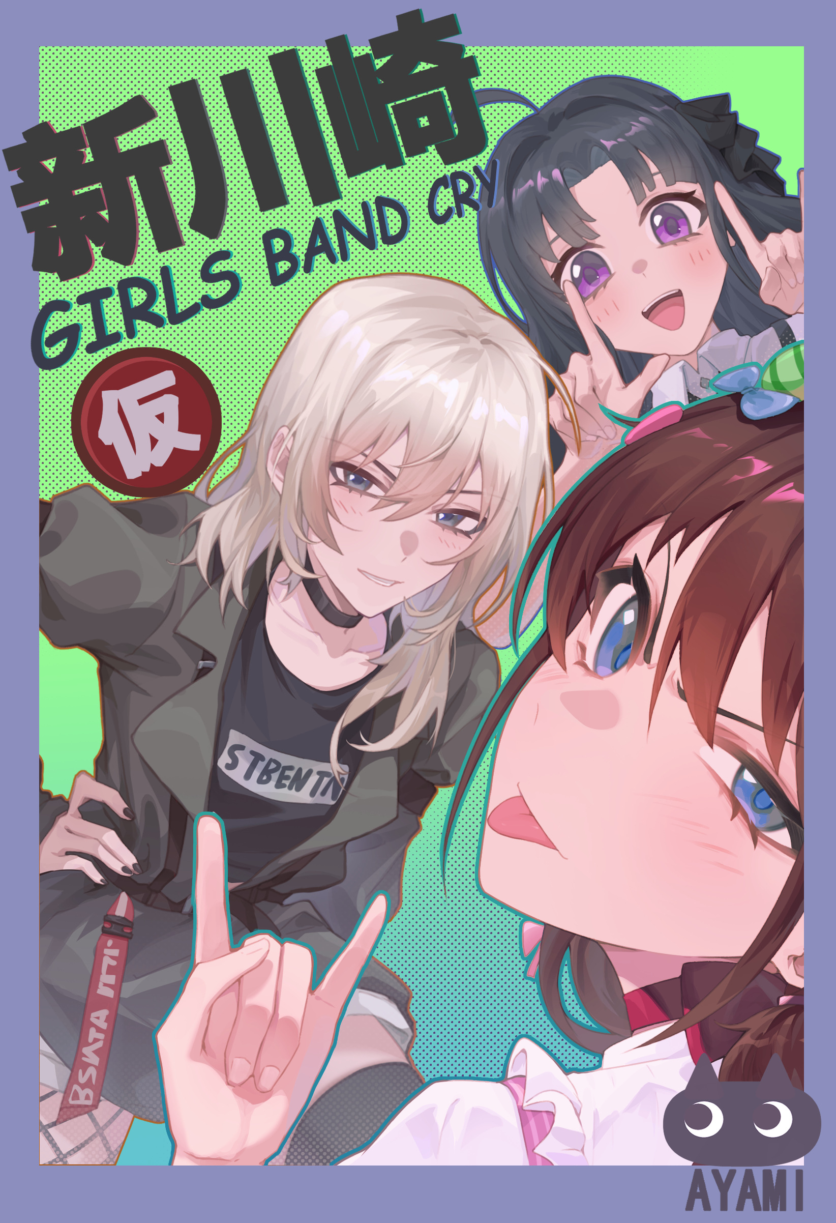 3girls absurdres ahoge awa_subaru ayami59266 black_choker black_hair black_shirt black_thighhighs blue_eyes blush brown_hair brown_jacket choker commentary copyright_name fishnet_thighhighs fishnets girls_band_cry grey_eyes grey_hair group_name hair_between_eyes hashtag-only_commentary highres index_fingers_raised iseri_nina jacket kawaragi_momoka koe_naki_sakana long_hair low_twintails multicolored_hair multiple_girls open_mouth parted_bangs purple_eyes roots_(hair) shirt short_hair short_twintails teeth thighhighs tongue tongue_out twintails upper_teeth_only