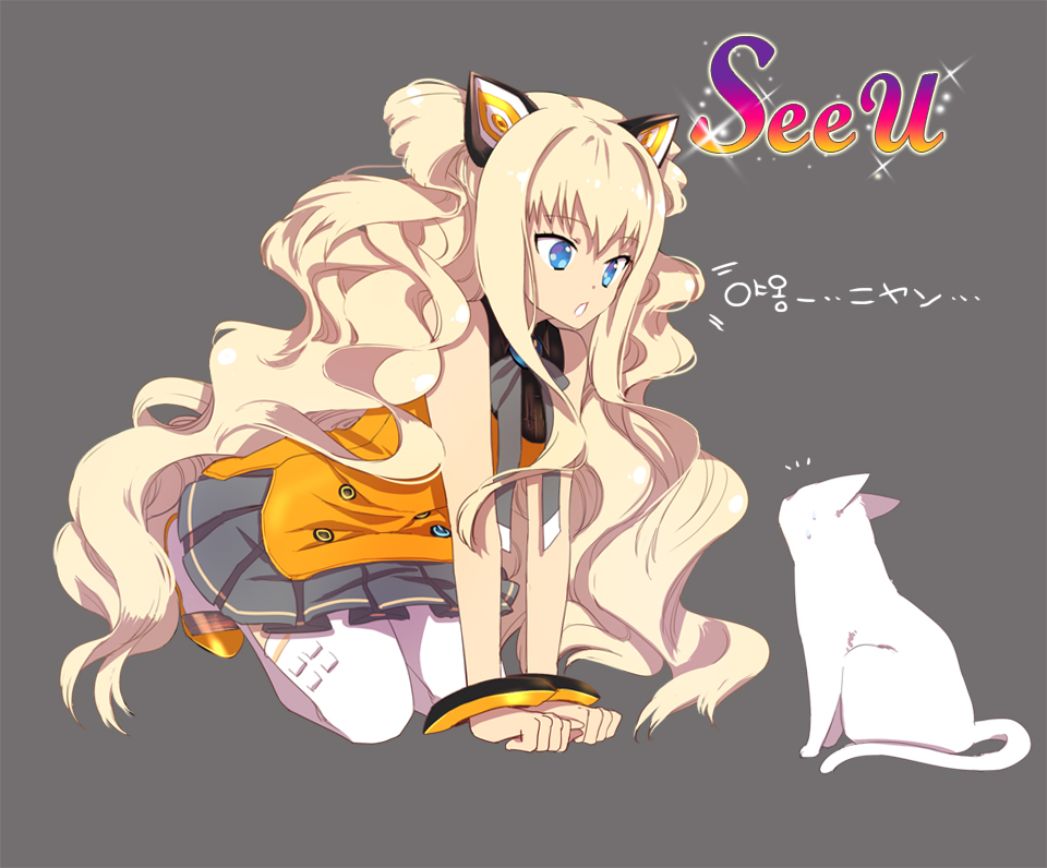 1girl all_fours animal_ears bad_id bad_pixiv_id blonde_hair blue_eyes bow bracelet cat cat_ears deilrimix dolgu female_focus jewelry korean_text long_hair seeu skirt solo thighhighs very_long_hair vocaloid white_thighhighs zettai_ryouiki