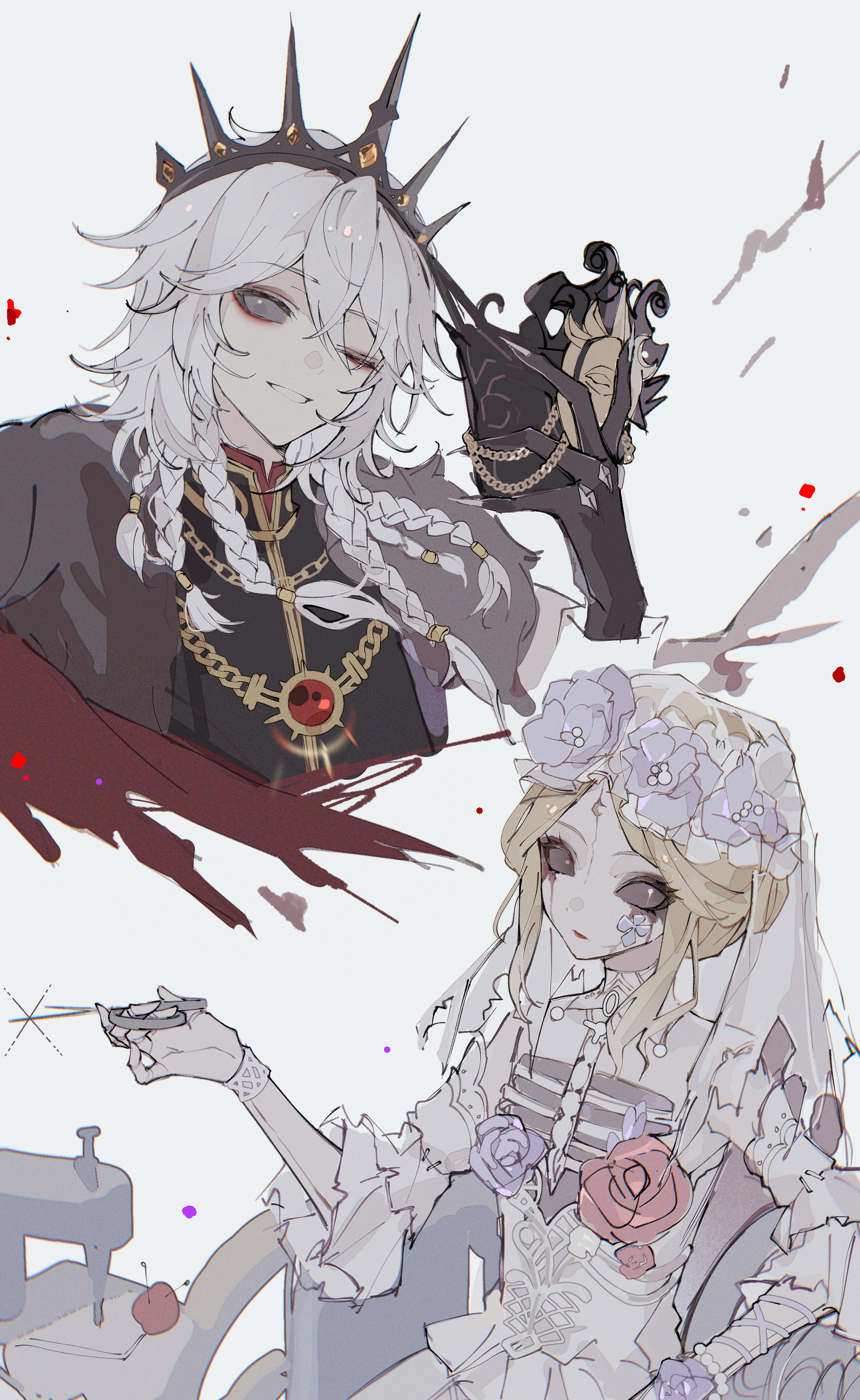 1boy 1girl absurdres androgynous bead_bracelet beads black_crown black_gloves black_sclera blonde_hair bracelet braid bridal_veil chain colored_sclera colored_skin crown detached_collar eyeshadow flower frilled_sleeves frills galatea_claude_(succubus) galatea_claude gloves hair_between_eyes head_tilt head_wreath highres holding holding_mask identity_v ithaqua_(identity_v) ithaqua_(morningstar)_(identity_v) jewelry long_hair makeup mask multiple_braids pale_skin pink_flower pink_rose purple_flower purple_rose red_eyeshadow red_lips ribs rose runny_makeup solid_eyes three-quarter_sleeves unworn_mask veil wheelchair white_hair white_skin white_wrist_cuffs wrist_cuffs yue_(shemika98425261)