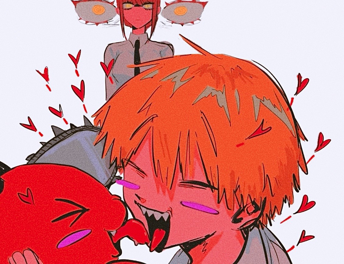 >_< 1boy 1girl ^_^ black_necktie blonde_hair blush_stickers chainsaw chainsaw_man closed_eyes commentary_request creature denji_(chainsaw_man) gaganbo_(shuuu85372871) heart jealous licking licking_another's_face looking_at_another makima_(chainsaw_man) necktie pochita_(chainsaw_man) red_hair ringed_eyes shaded_face sharp_teeth shirt simple_background teeth white_background white_shirt
