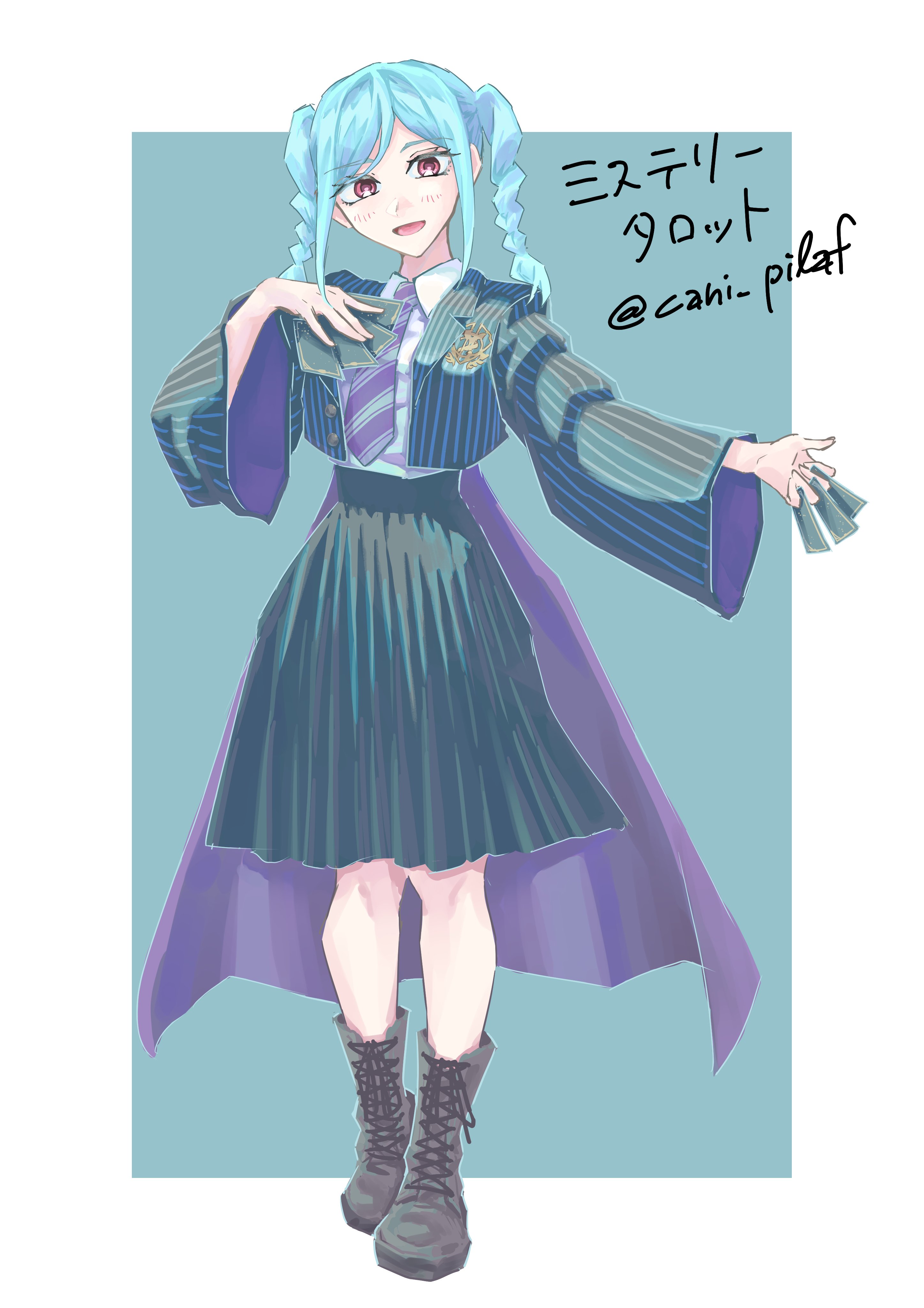 1girl :d absurdres aqua_background black_boots blue_hair boots border braid cani_pilaf card collared_shirt commentary_request diagonal-striped_clothes diagonal-striped_necktie dress_shirt full_body highres holding holding_card jacket lace-up_boots liella!_solo_outfit_design_vote long_sleeves looking_at_viewer love_live! love_live!_superstar!! medium_skirt necktie onitsuka_tomari open_clothes open_jacket open_mouth outside_border pink_eyes pinstripe_jacket pinstripe_pattern pleated_skirt purple_necktie shirt sidelocks simple_background skirt smile solo striped_clothes twin_braids white_border white_shirt wild_card_(love_live!)