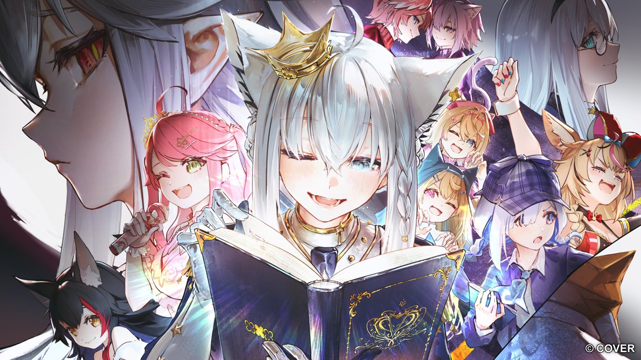 6+girls :o ;d ahoge alternate_costume alternate_hairstyle amane_kanata animal_ear_fluff animal_ear_piercing animal_ears aqua_eyes arms_up bandaid bandaid_hair_ornament black_hair black_streaks blonde_hair blue_eyes blue_hair blue_hairband blue_jacket blue_neckerchief book bow bowtie braid cat_ears cat_girl cat_tail closed_eyes closed_mouth coif collared_shirt colored_inner_hair commentary_request copyright_notice crossed_bangs crown deerstalker dog_ears dog_girl double-parted_bangs dress fake_horns flipped_hair fox_ears fox_girl frilled_gloves frills fuwawa_abyssgard glasses gloves gold_tiara green_eyes grey_hair hair_between_eyes hair_ornament hair_over_one_eye hairband hairclip hat head_wings holding holding_book holding_microphone hololive hololive_english horn_hairband horns hyde_(tabakko) jacket jester_cap long_hair low_twin_braids messy_hair microphone mini_crown mococo_abyssgard multicolored_hair multiple_girls neckerchief nekomata_okayu nun nurse_cap official_alternate_costume official_alternate_hairstyle official_art omaru_polka omaru_polka_(1st_costume) one_eye_closed ookami_mio open_mouth outstretched_arms parallel_hairclips pink_dress pink_eyes pink_hair pink_hairband pink_streaks pink_wings pointy_ears purple_eyes purple_hair purple_hat purple_sweater red_bow red_bowtie red_hair ribbed_sweater sakura_miko sakura_miko_(flower_fantasista!) shirakami_fubuki shirakami_fubuki_(fbkingdom) shirt short_hair side_braid sidelocks smile streaked_hair sweater swept_bangs tail takane_lui tilted_headwear turtleneck turtleneck_sweater twin_braids two_side_up virtual_youtuber white_gloves white_hair white_shirt wings wolf_ears wolf_girl x_hair_ornament yellow_eyes
