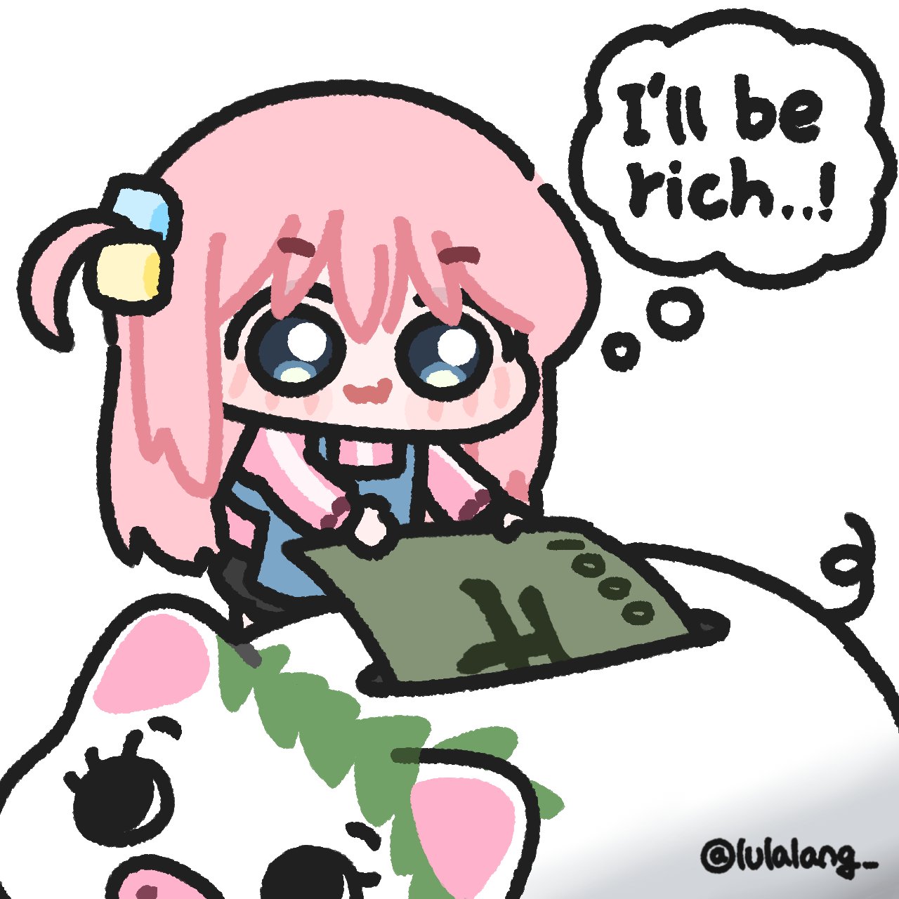 1girl apron banknote bocchi_the_rock! chibi english_text gotoh_hitori highres lulalang mini_person minigirl money piggy_bank speech_bubble thought_bubble
