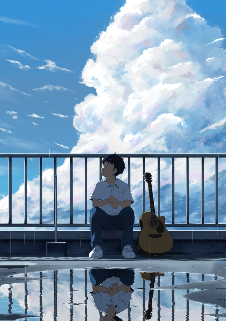 1boy black_hair blue_pants blue_sky breast_pocket cloud cloudy_sky collared_shirt commentary_request day expressionless full_body grey_shirt grey_shoes guitar instrument kawayoshi looking_to_the_side male_focus original outdoors pants pocket puddle railing reflection reflective_liquid shirt shoes short_hair short_sleeves sitting sky sky_focus solo straight-on very_short_hair wing_collar