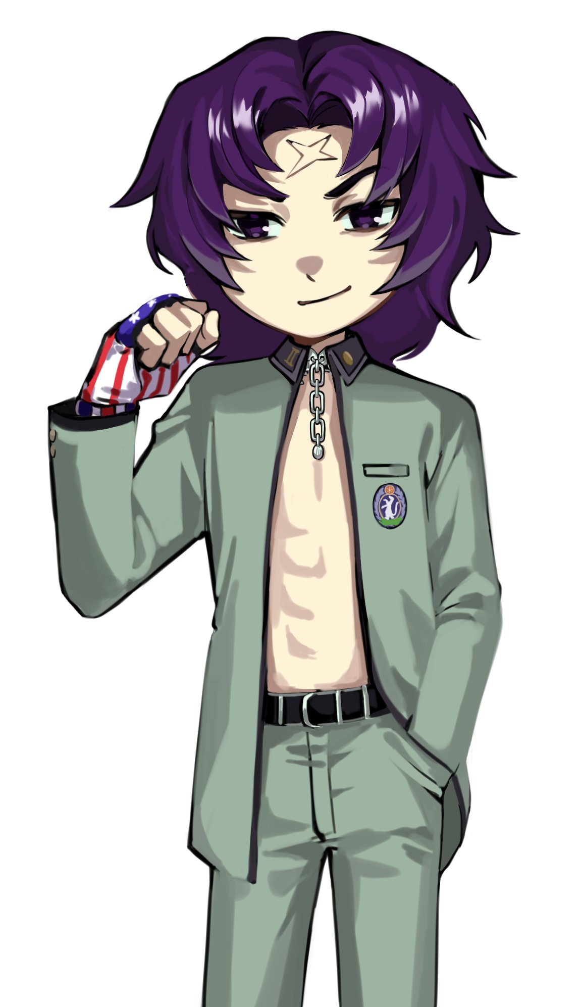 1boy american_flag american_flag_print clenched_hand closed_mouth commentary commentary_request english_commentary fingerless_gloves flag_print gloves green_jacket green_pants hand_in_pocket hand_up highres jacket kido_reiji kkkp010101 korean_commentary long_sleeves looking_at_viewer male_focus medium_hair mixed-language_commentary open_clothes open_jacket pants persona persona_1 print_gloves purple_eyes purple_hair scar scar_on_face school_uniform second-party_source simple_background smile solo st._hermelin_school_uniform standing white_background
