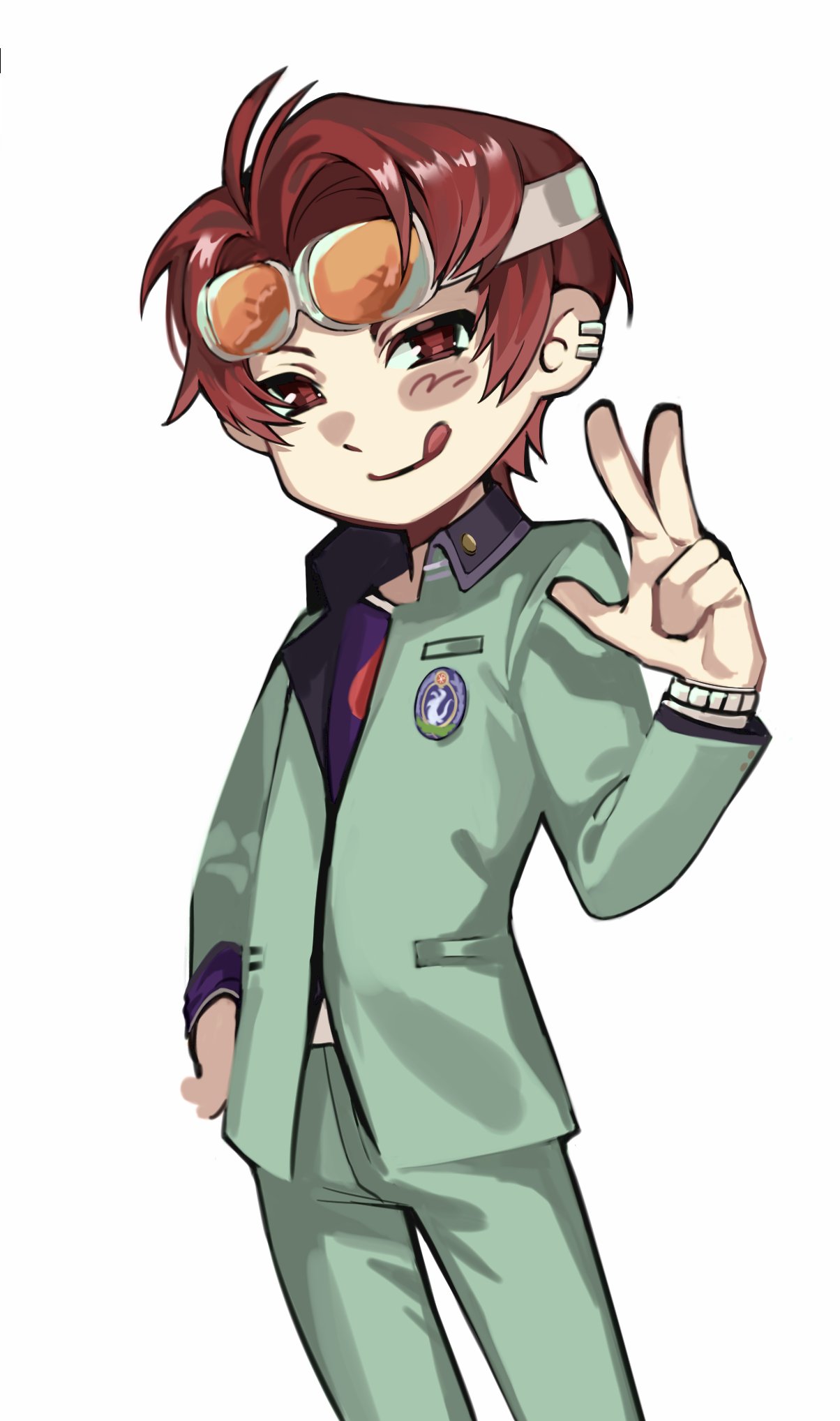 1boy blush closed_mouth commentary commentary_request english_commentary goggles goggles_on_head green_jacket green_pants hand_up highres jacket kkkp010101 korean_commentary licking_lips long_sleeves looking_at_viewer male_focus mixed-language_commentary pants persona persona_1 red_eyes red_hair school_uniform second-party_source short_hair simple_background smile solo st._hermelin_school_uniform standing tongue tongue_out uesugi_hidehiko white_background